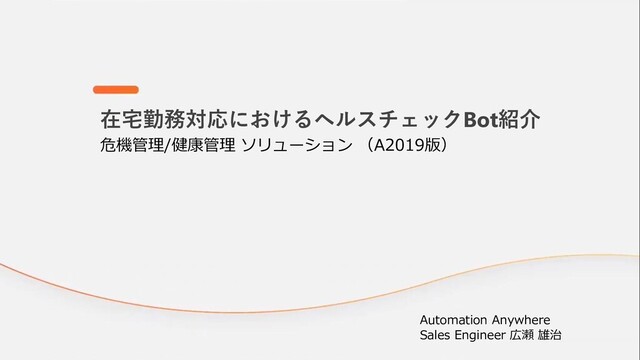在宅勤務対応におけるヘルスチェックBot紹介 危機管理/健康管理 ソリューション (A2019版) Automation Anywhere Sales Engineer 広瀬 雄治