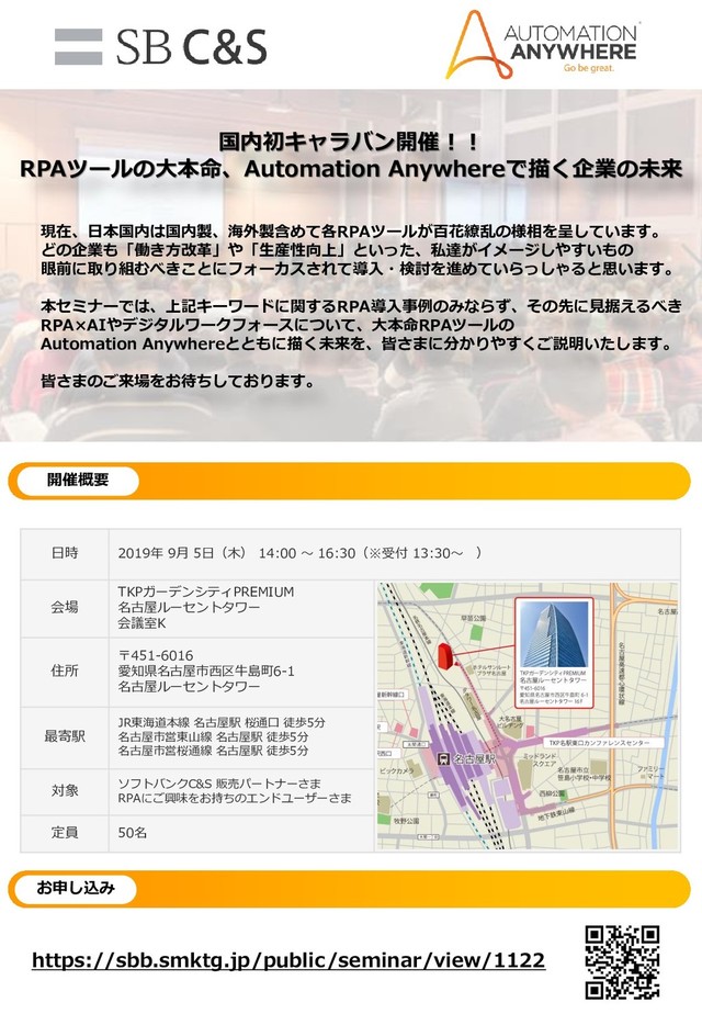 ※講演のテーマ、講師、時間などは、一部変更になる場合がございます。 ※製品名およびサービス名などは、各社の登録商標となります。 セミナープログラム お問い合わせ SB C&S株式会社 Automation Anywhereイベント窓口 Mail: