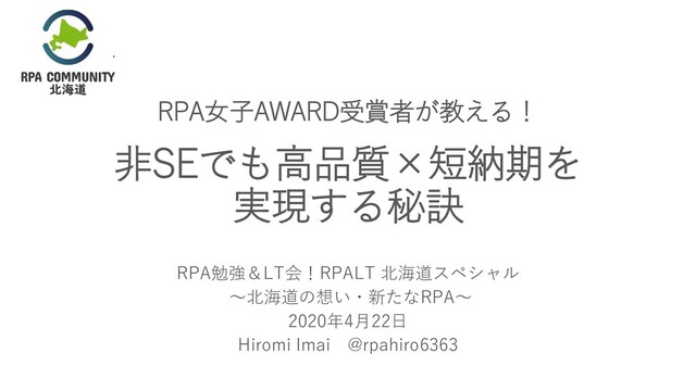 非SEでも高品質×短納期を 実現する秘訣 RPA勉強&LT会!RPALT 北海道スペシャル ~北海道の想い・新たなRPA~ 2020年4月22日 Hiromi Imai @rpahiro6363 RPA女子AWARD受賞者が教える!