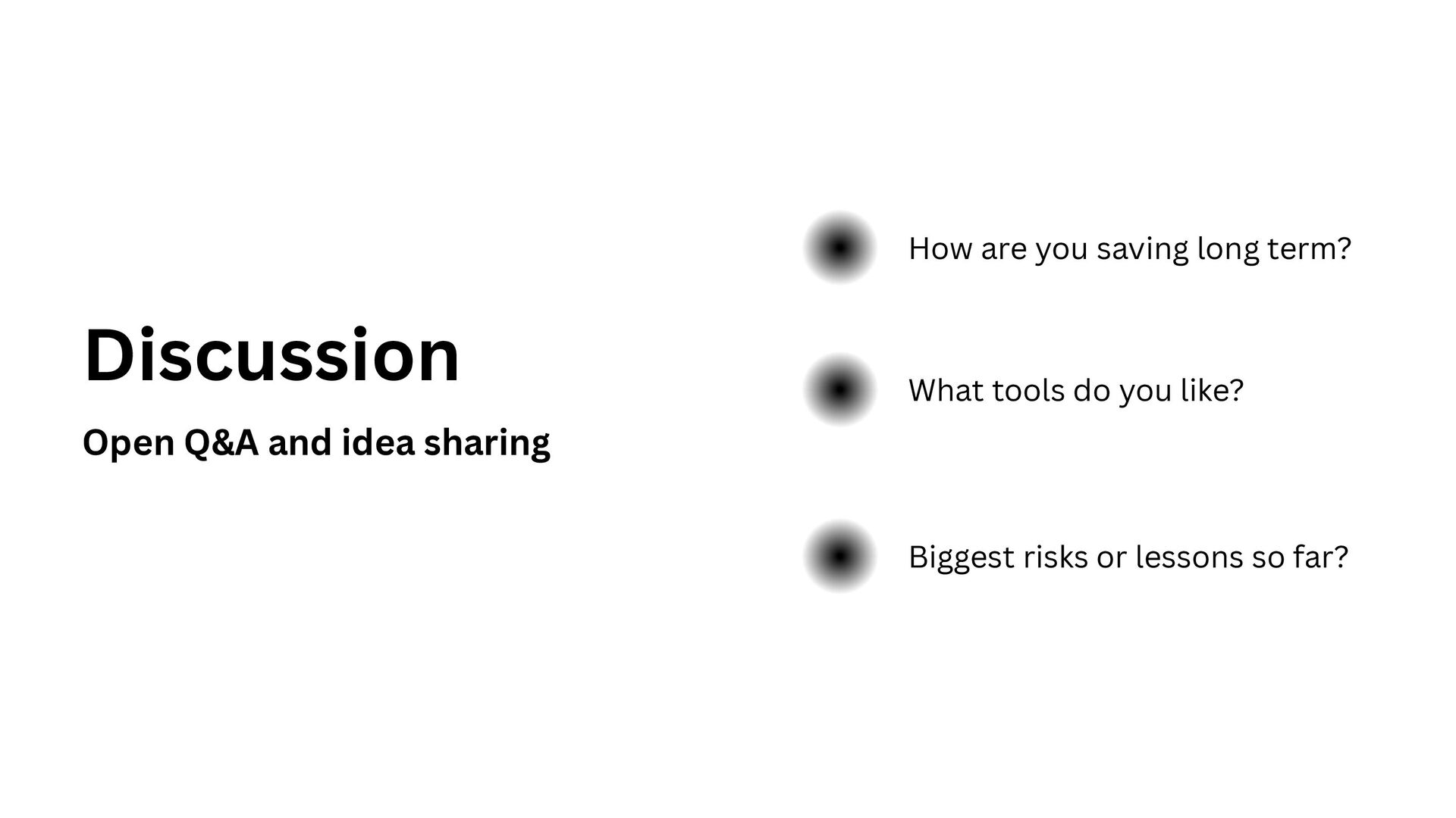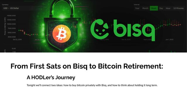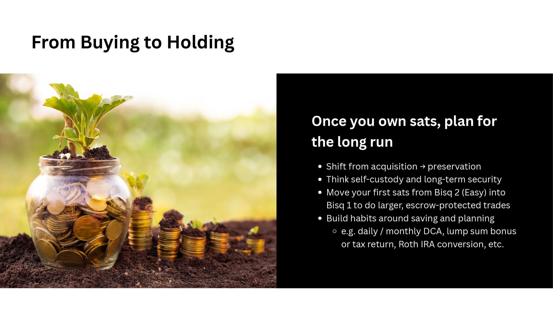 the long run Shift from acquisition → preservation Think self-custody and long-term security Move your first sats from Bisq 2 (Easy) into Bisq 1 to do larger, escrow-protected trades Build habits around saving and planning e.g. daily / monthly DCA, lump sum bonus or tax return, Roth IRA conversion, etc.