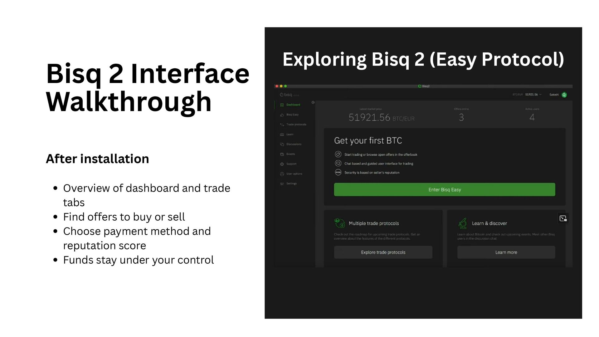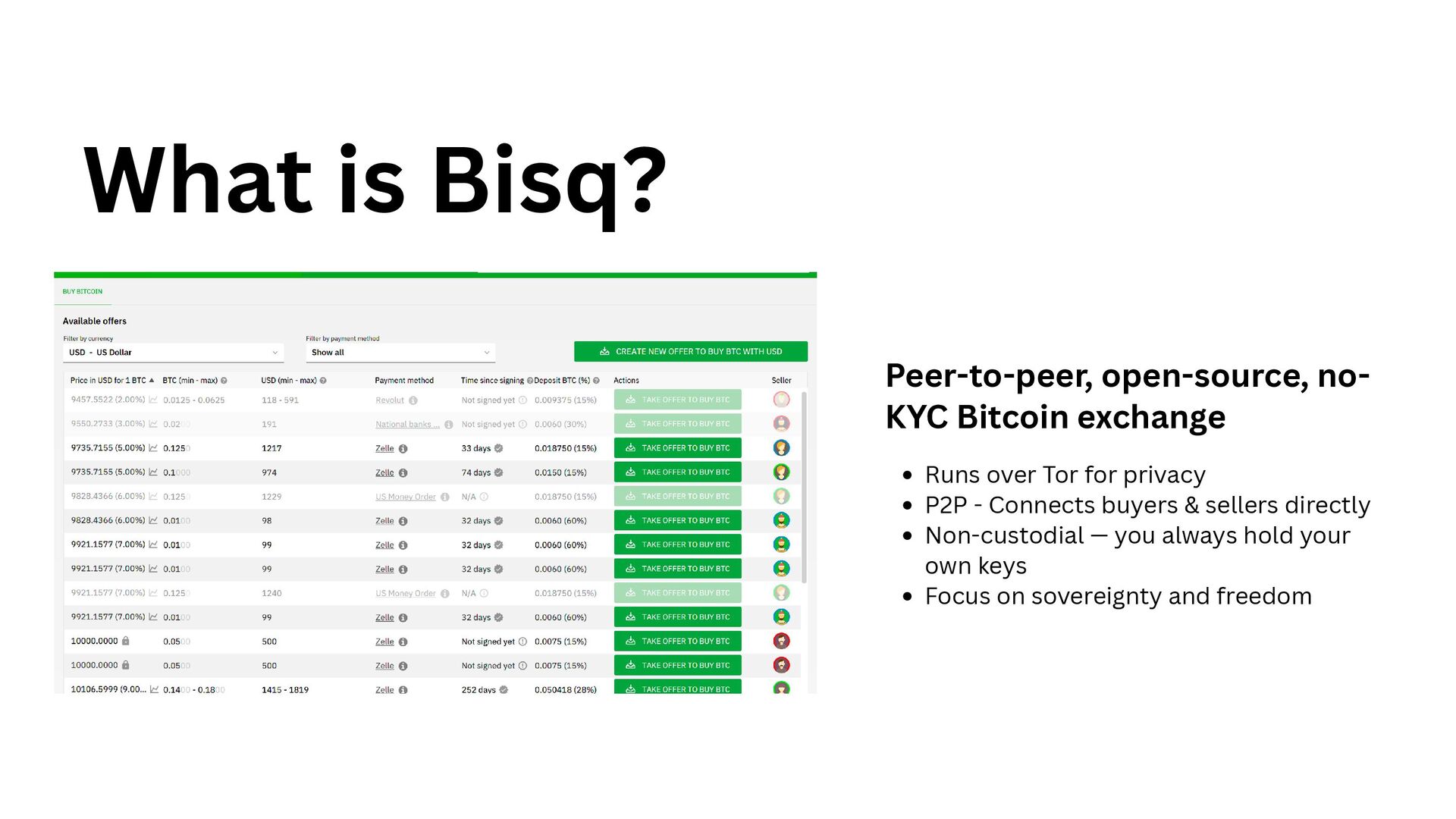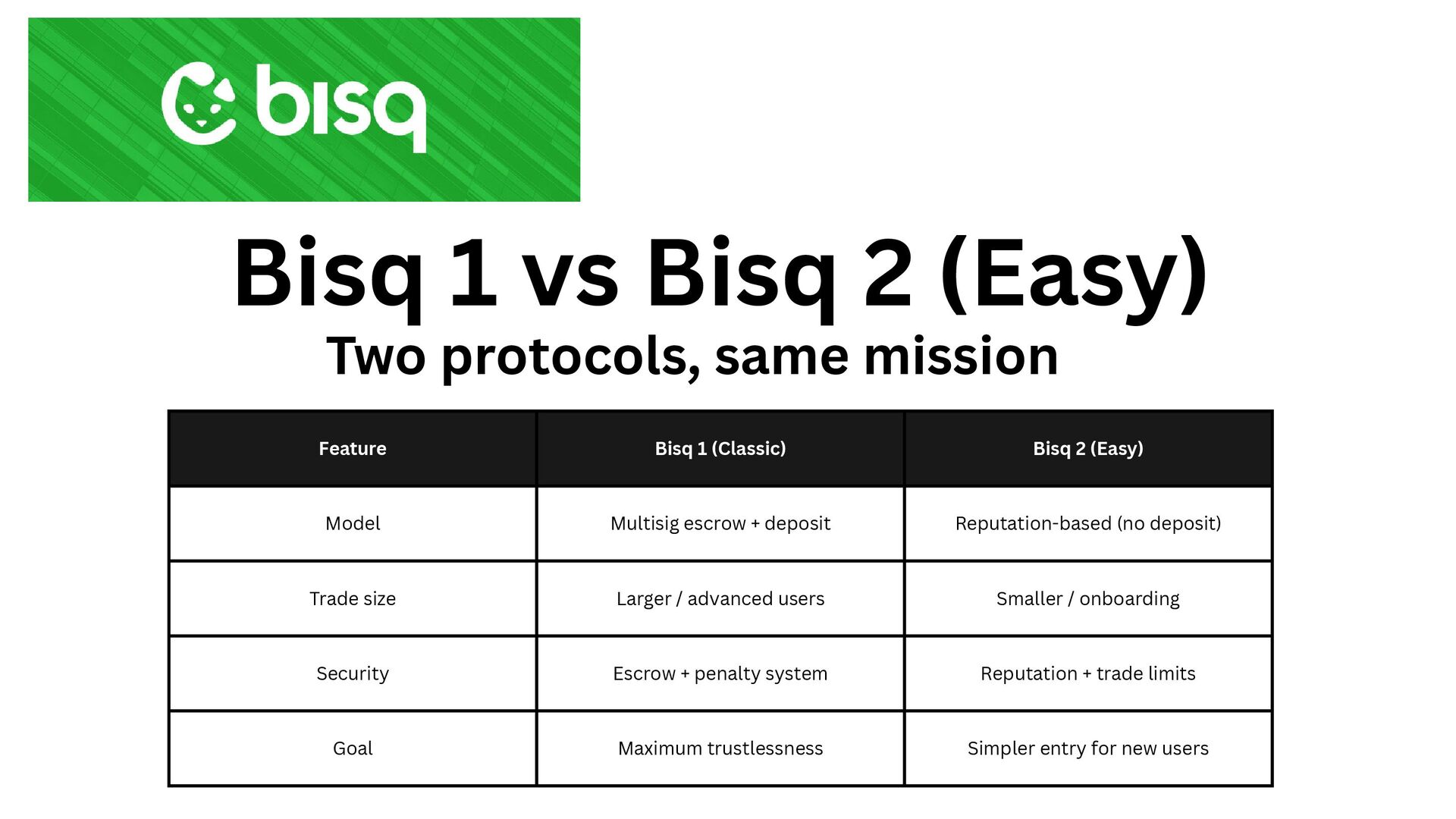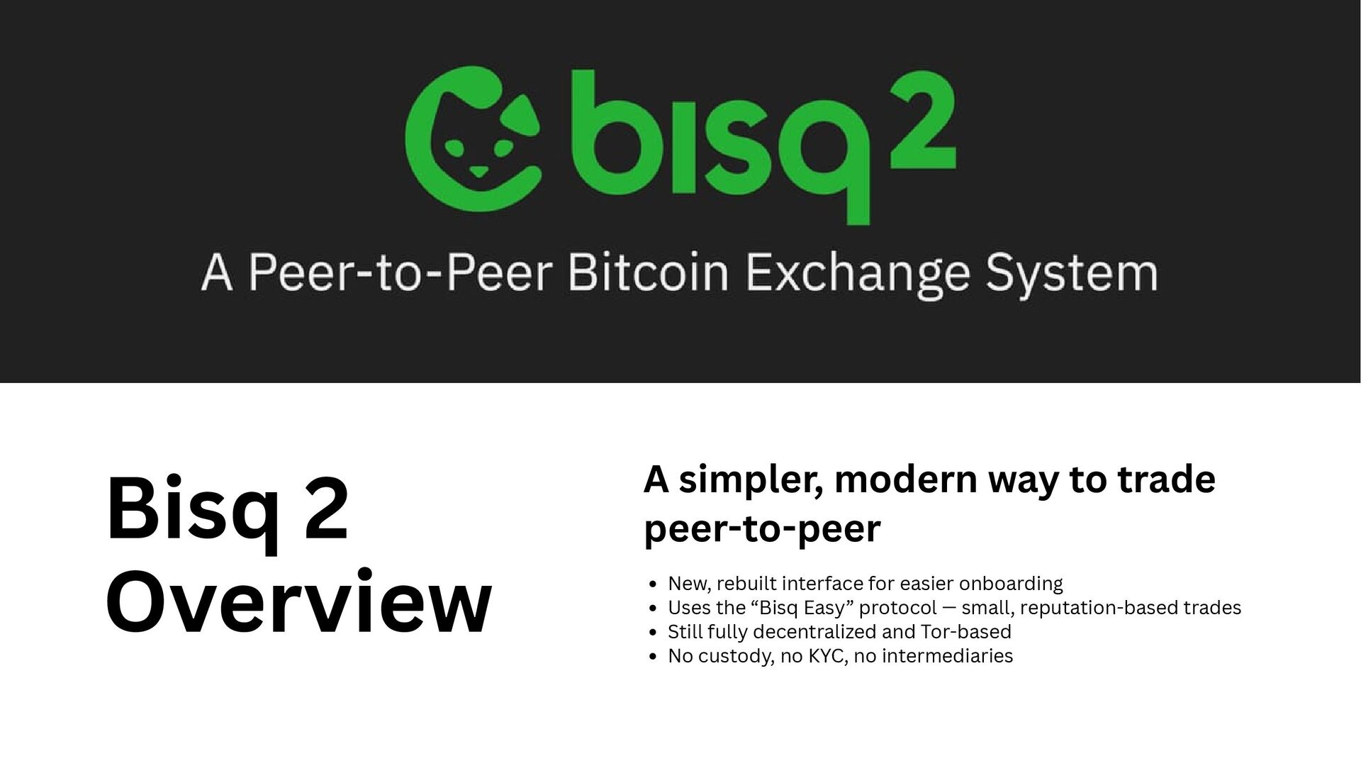 protocol — small, reputation-based trades Still fully decentralized and Tor-based No custody, no KYC, no intermediaries A simpler, modern way to trade peer-to-peer Bisq 2 Overview