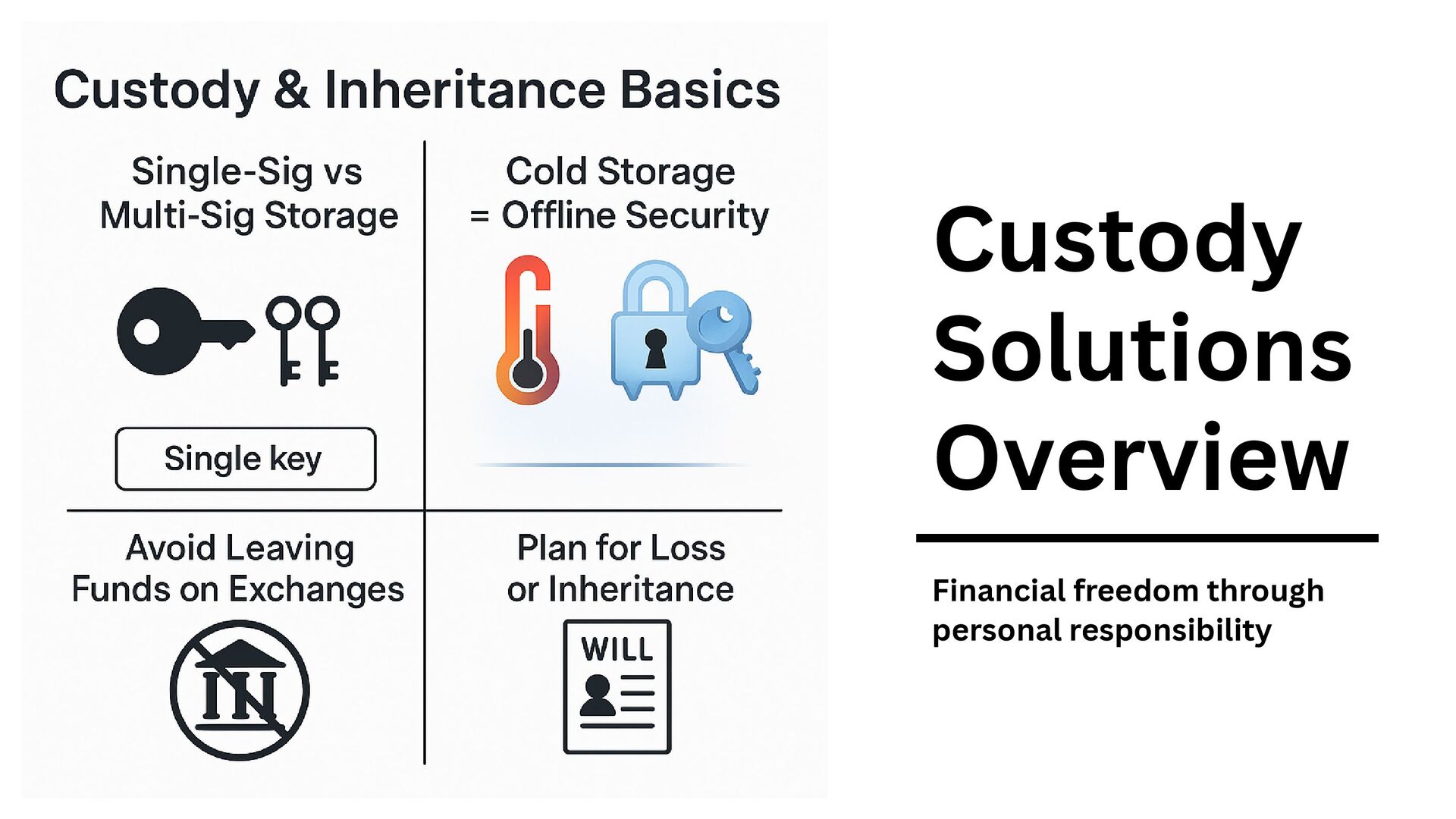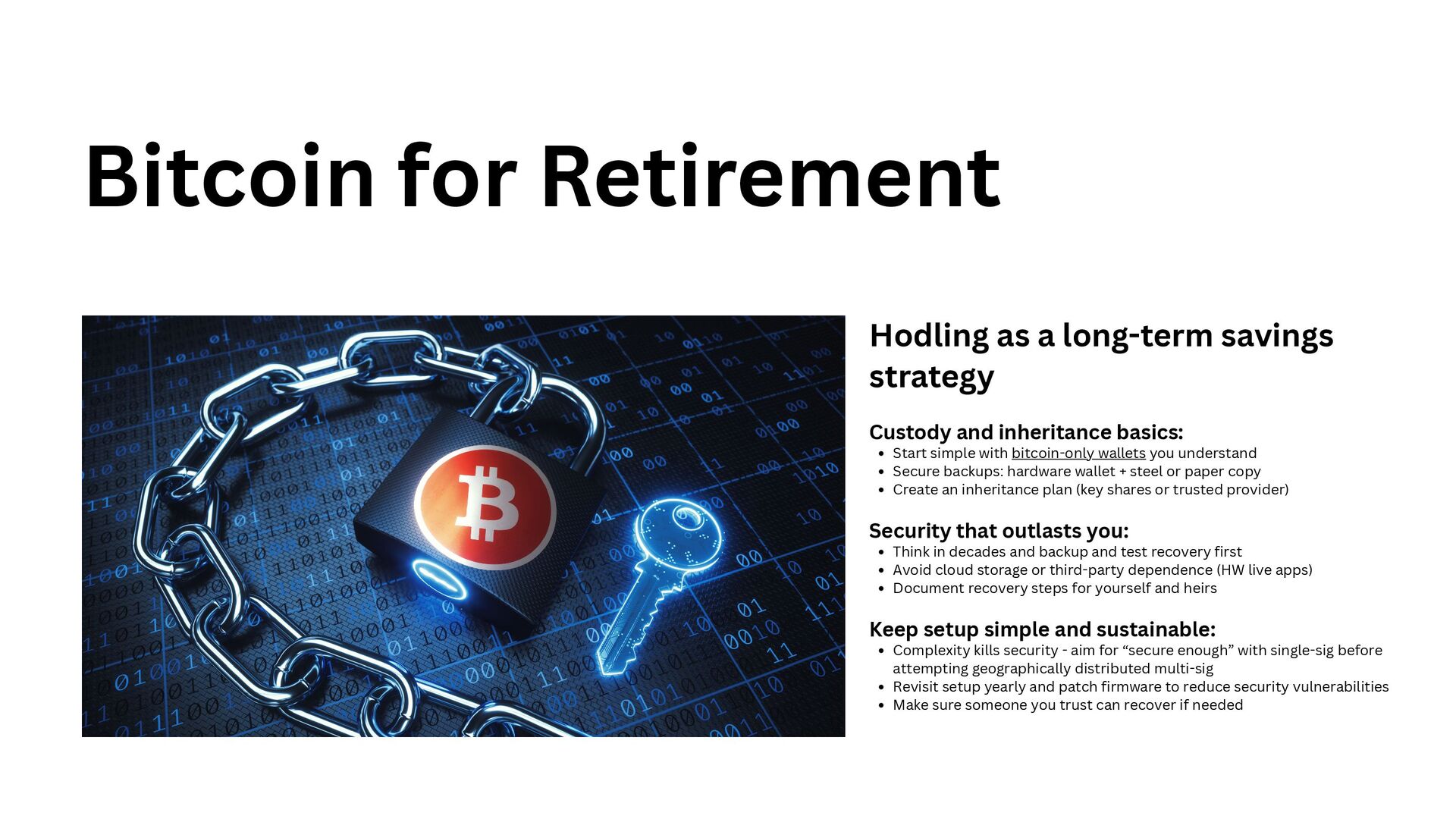 and inheritance basics: Start simple with bitcoin-only wallets you understand Secure backups: hardware wallet + steel or paper copy Create an inheritance plan (key shares or trusted provider) Security that outlasts you: Think in decades and backup and test recovery first Avoid cloud storage or third-party dependence (HW live apps) Document recovery steps for yourself and heirs Keep setup simple and sustainable: Complexity kills security - aim for “secure enough” with single-sig before attempting geographically distributed multi-sig Revisit setup yearly and patch firmware to reduce security vulnerabilities Make sure someone you trust can recover if needed