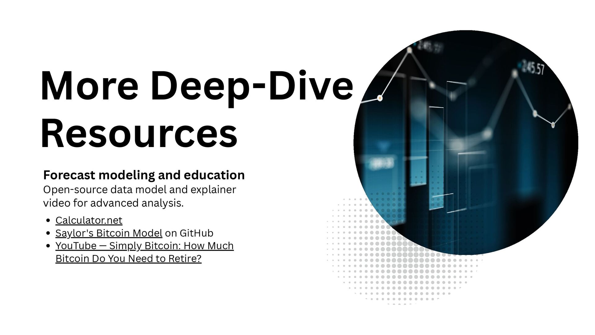 for advanced analysis. Calculator.net Saylor's Bitcoin Model on GitHub YouTube — Simply Bitcoin: How Much Bitcoin Do You Need to Retire? More Deep-Dive Resources