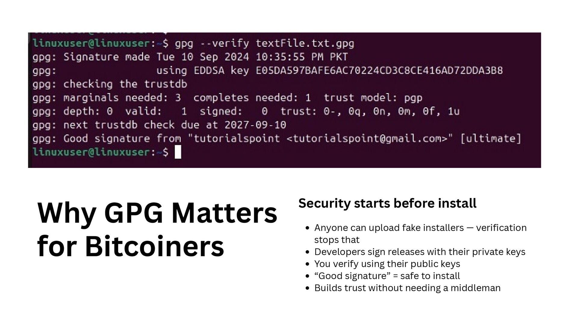 can upload fake installers — verification stops that Developers sign releases with their private keys You verify using their public keys “Good signature” = safe to install Builds trust without needing a middleman
