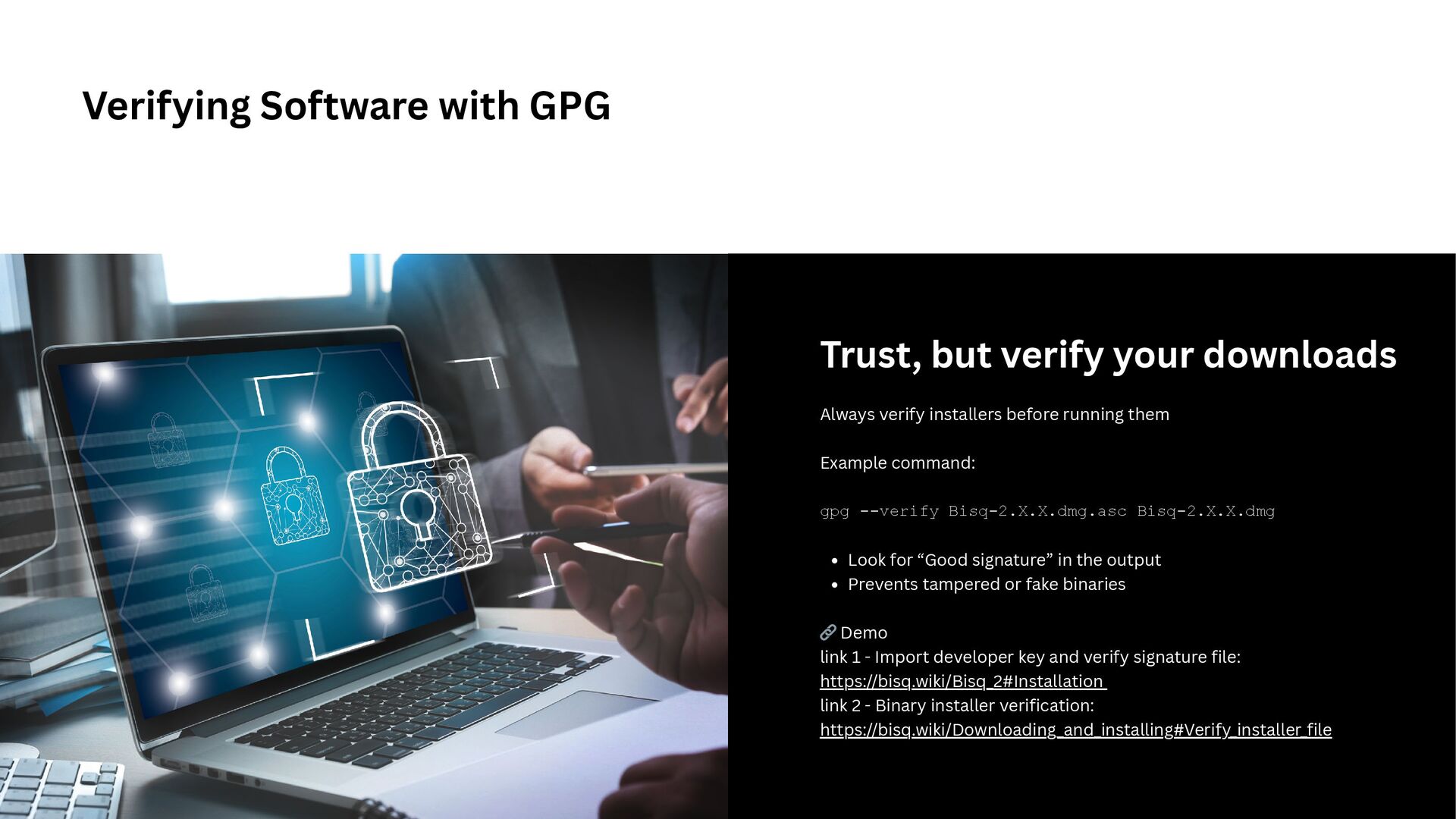 verify installers before running them Example command: gpg --verify Bisq-2.X.X.dmg.asc Bisq-2.X.X.dmg Look for “Good signature” in the output Prevents tampered or fake binaries 🔗 Demo link 1 - Import developer key and verify signature file: https://bisq.wiki/Bisq_2#Installation link 2 - Binary installer verification: https://bisq.wiki/Downloading_and_installing#Verify_installer_file