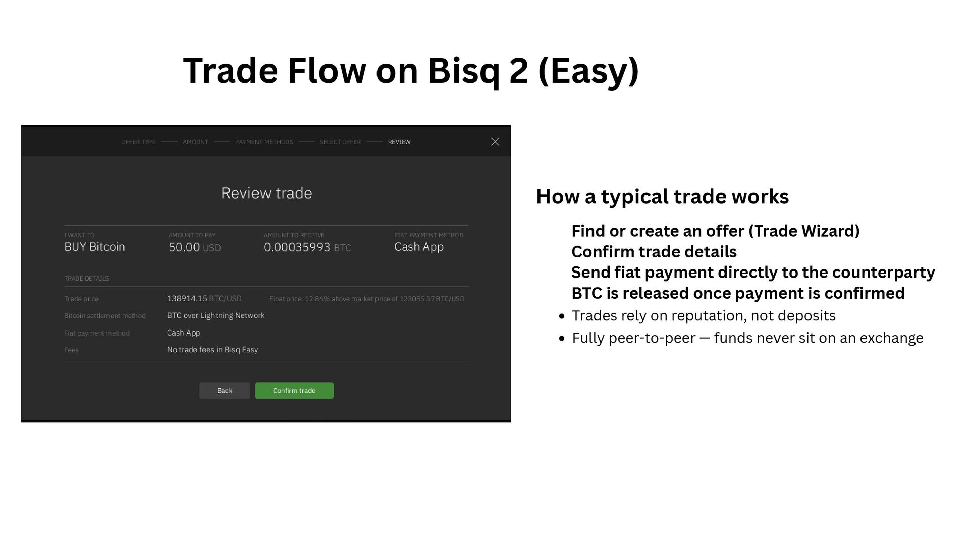 works Trades rely on reputation, not deposits Fully peer-to-peer — funds never sit on an exchange 1️⃣ Find or create an offer (Trade Wizard) 2️⃣ Confirm trade details 3️⃣ Send fiat payment directly to the counterparty 4️⃣ BTC is released once payment is confirmed