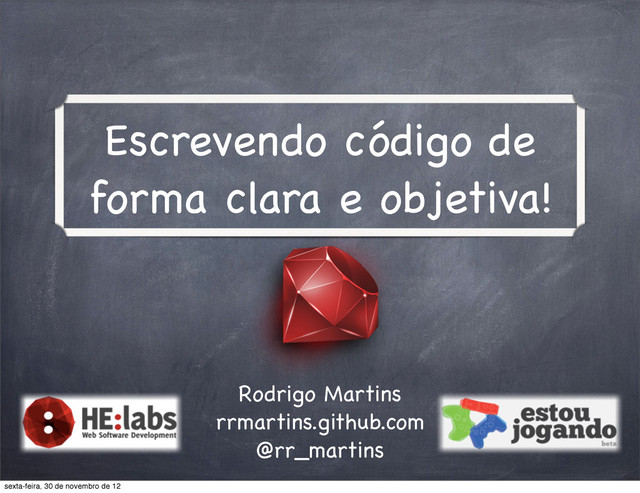 o que pode ser feito com essa linguagem. ” Yukihiro Matsumoto “...A outra é olhar para o que sentimos usando essa linguagem, como nos sentimos durante a programação..." sexta-feira, 30 de novembro de 12