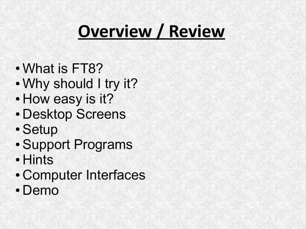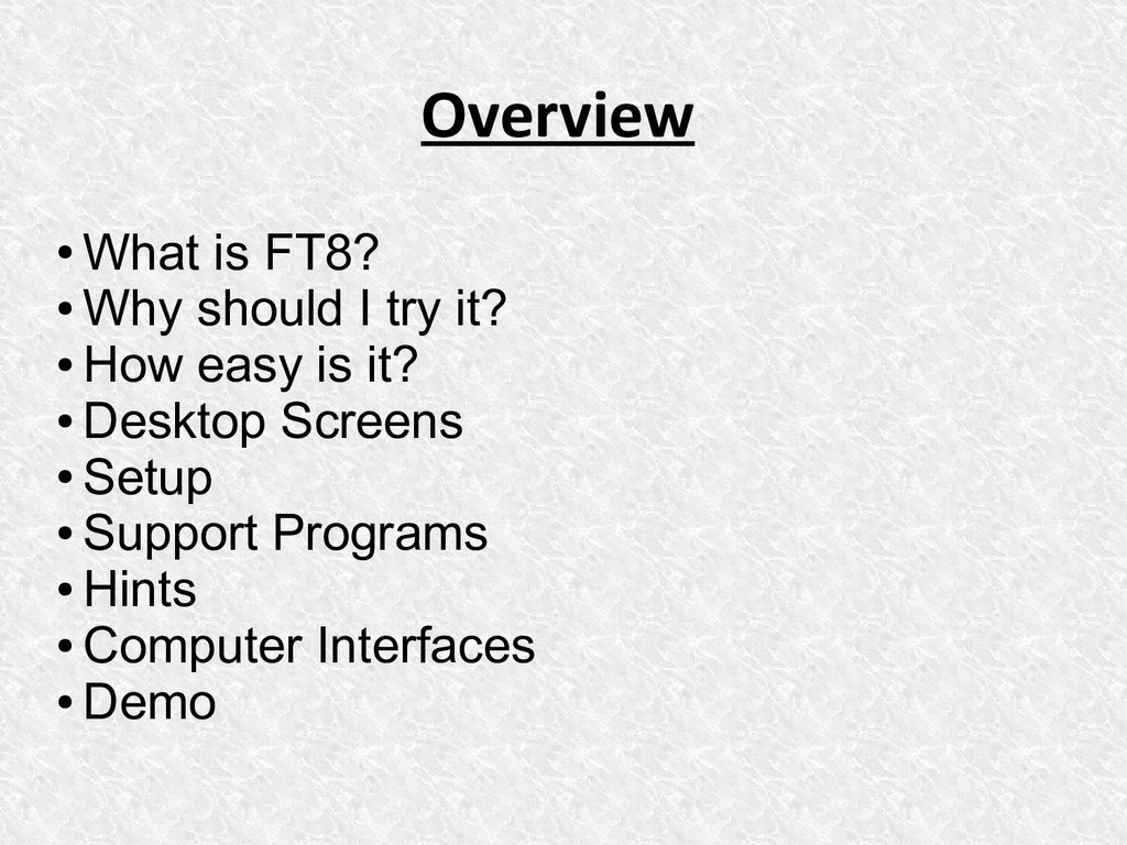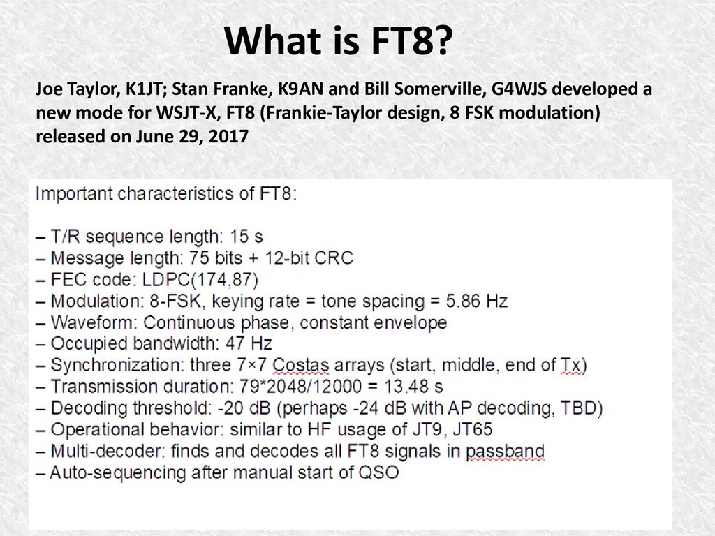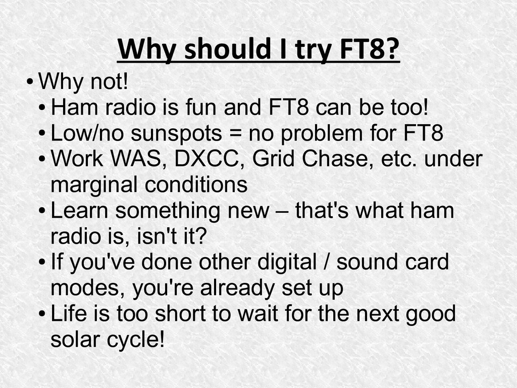 radio is fun and FT8 can be too! • Low/no sunspots = no problem for FT8 • Work WAS, DXCC, Grid Chase, etc. under marginal conditions • Learn something new – that's what ham radio is, isn't it? • If you've done other digital / sound card modes, you're already set up • Life is too short to wait for the next good solar cycle!