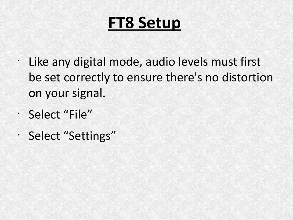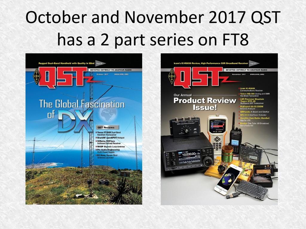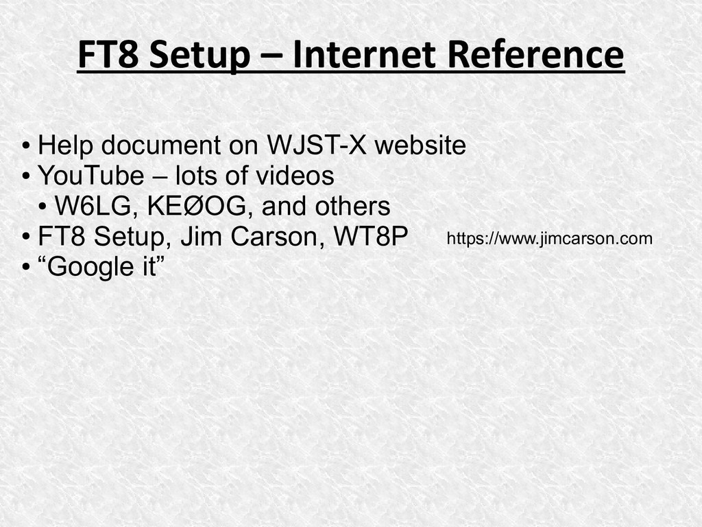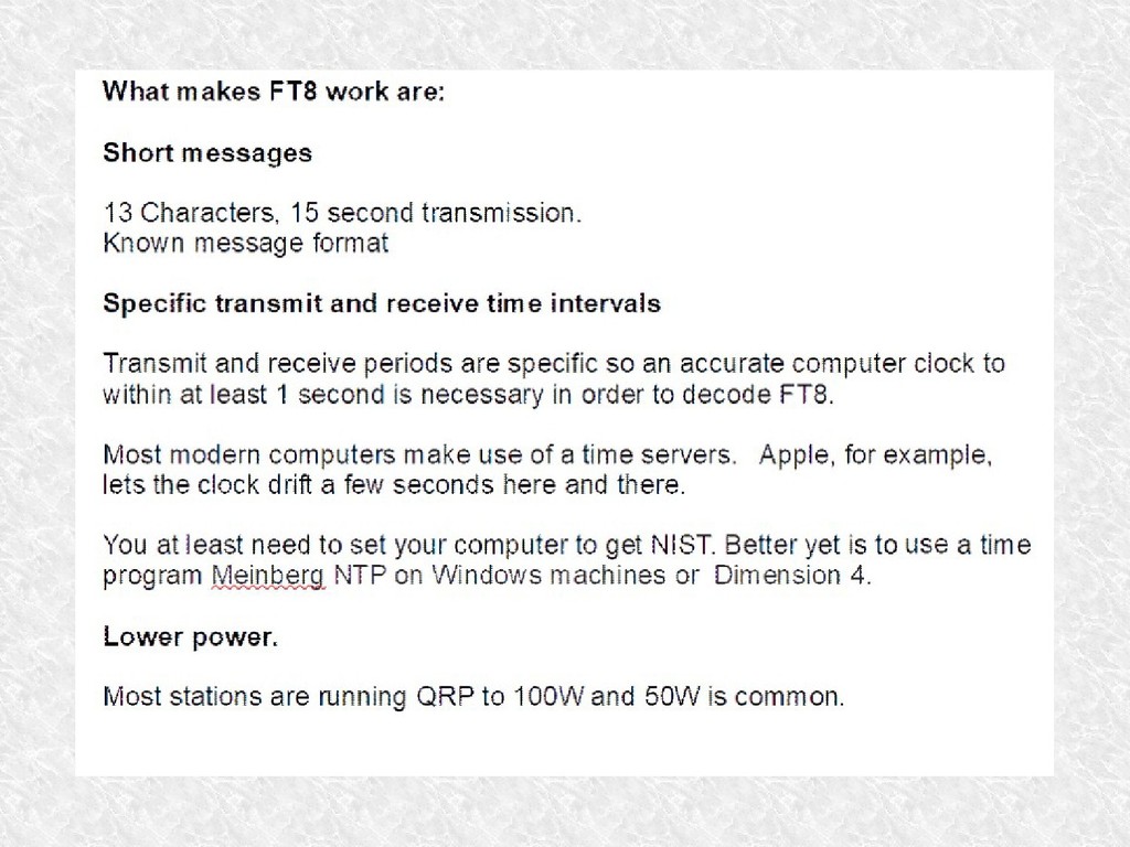 radio is fun and FT8 can be too! • Low/no sunspots = no problem for FT8 • Work WAS, DXCC, Grid Chase, etc. under marginal conditions • Learn something new – that's what ham radio is, isn't it? • If you've done other digital / sound card modes, you're already set up • Life is too short to wait for the next good solar cycle!