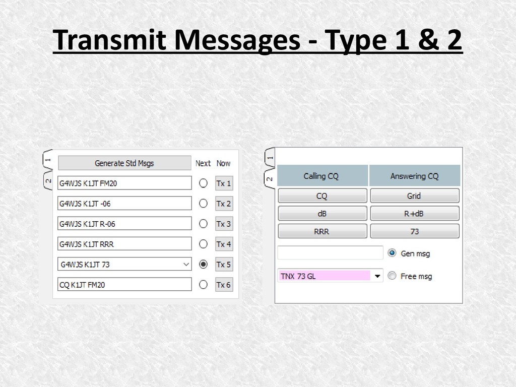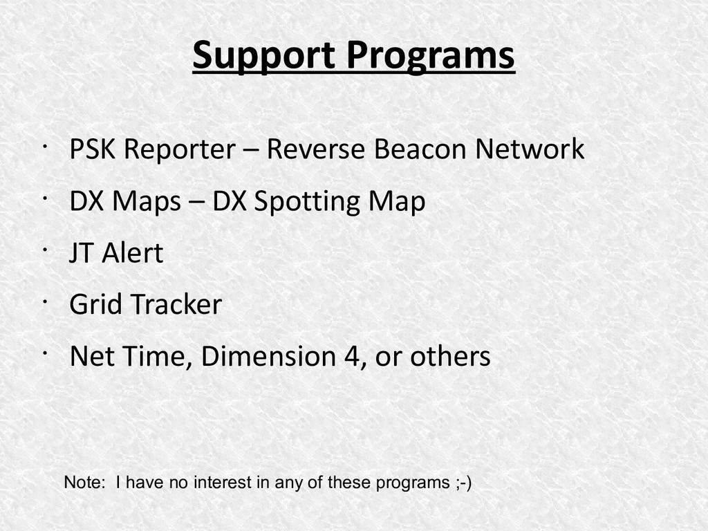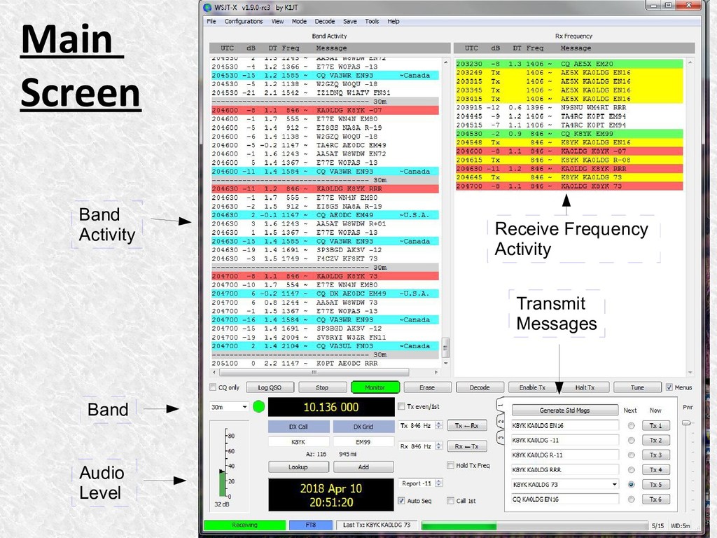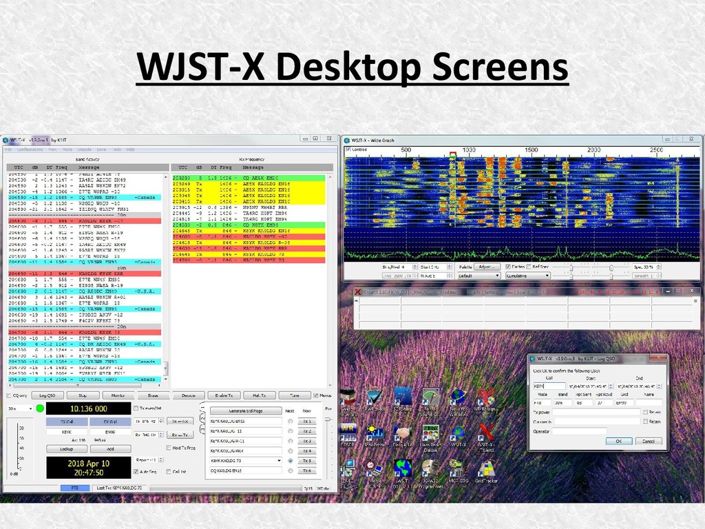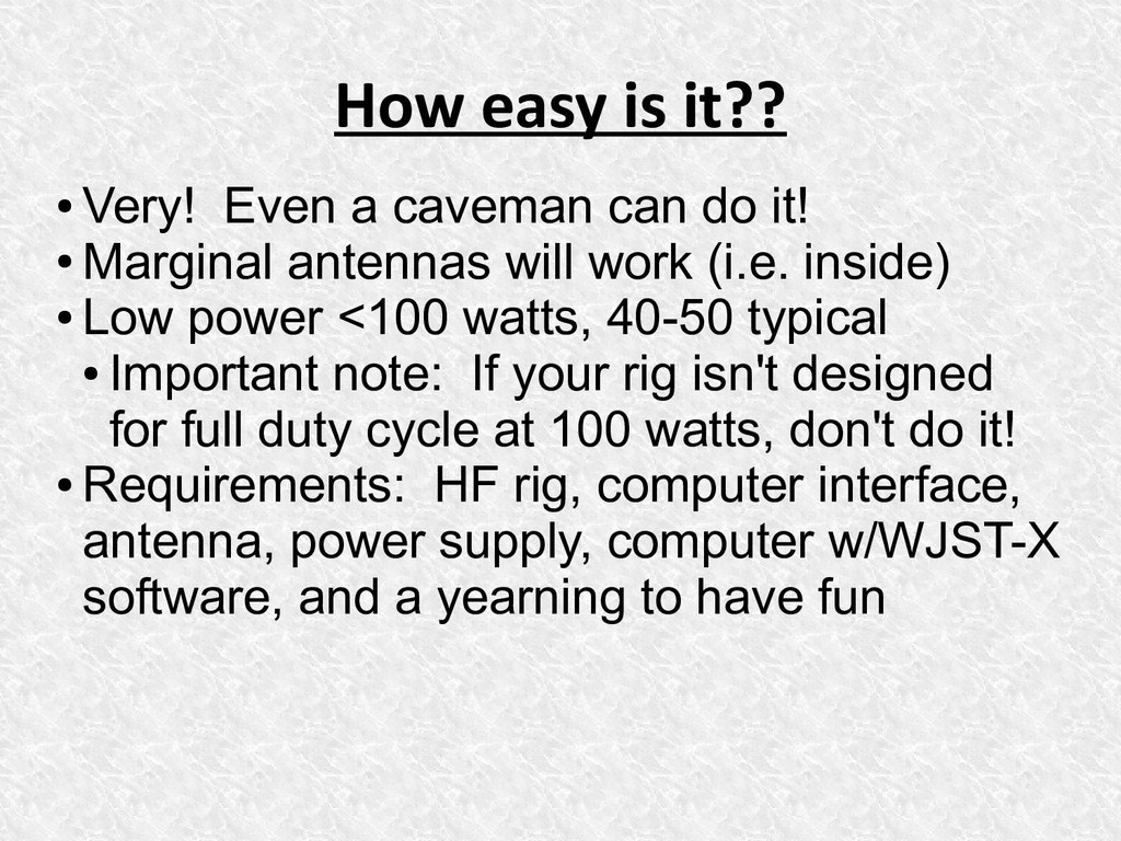 do it! • Marginal antennas will work (i.e. inside) • Low power <100 watts, 40-50 typical • Important note: If your rig isn't designed for full duty cycle at 100 watts, don't do it! • Requirements: HF rig, computer interface, antenna, power supply, computer w/WJST-X software, and a yearning to have fun