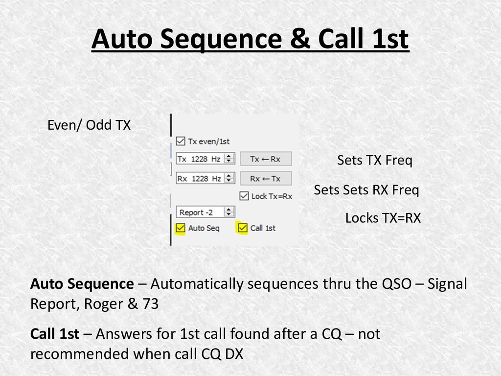 Freq Sets Sets RX Freq Locks TX=RX Auto Sequence – Automatically sequences thru the QSO – Signal Report, Roger & 73 Call 1st – Answers for 1st call found after a CQ – not recommended when call CQ DX
