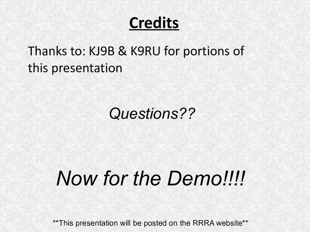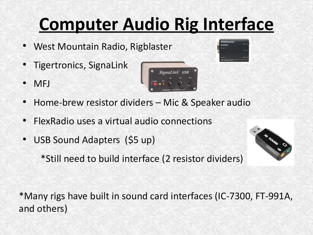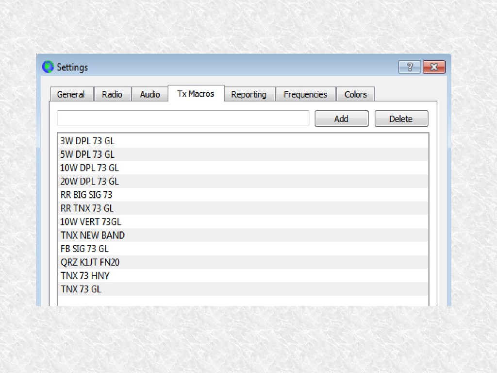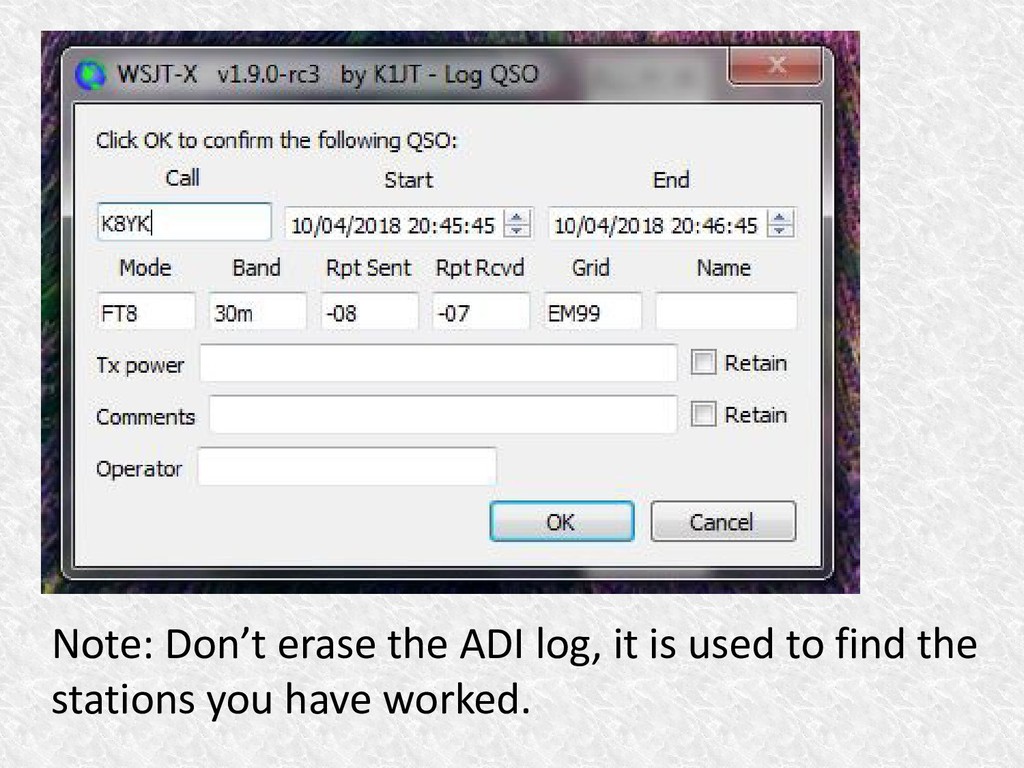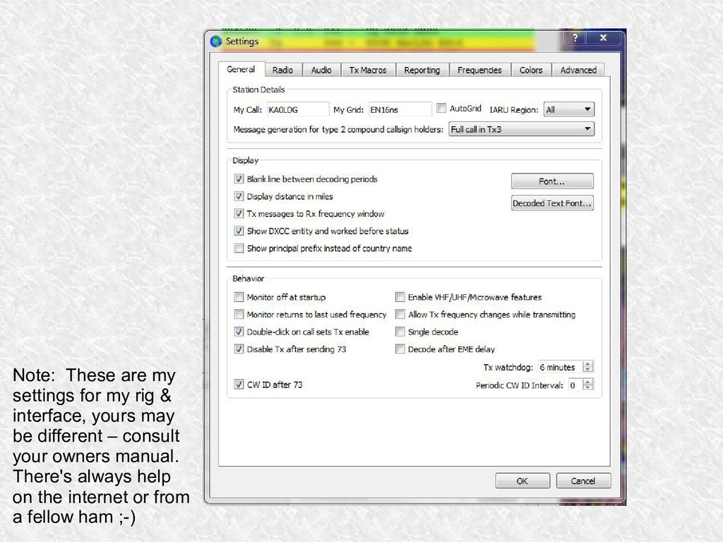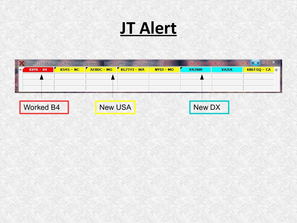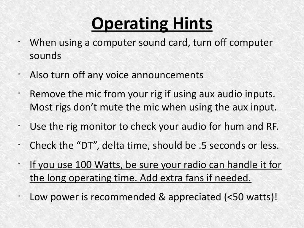 off computer sounds • Also turn off any voice announcements • Remove the mic from your rig if using aux audio inputs. Most rigs don’t mute the mic when using the aux input. • Use the rig monitor to check your audio for hum and RF. • Check the “DT”, delta time, should be .5 seconds or less. • If you use 100 Watts, be sure your radio can handle it for the long operating time. Add extra fans if needed. • Low power is recommended & appreciated (<50 watts)!