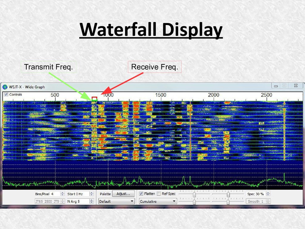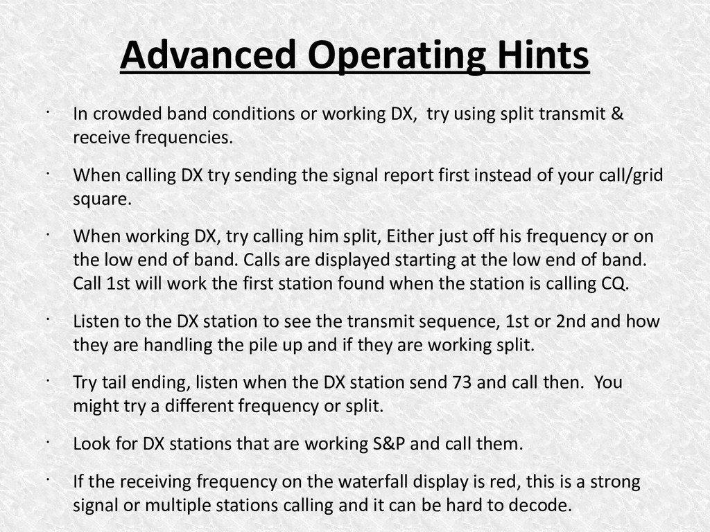 DX, try using split transmit & receive frequencies. • When calling DX try sending the signal report first instead of your call/grid square. • When working DX, try calling him split, Either just off his frequency or on the low end of band. Calls are displayed starting at the low end of band. Call 1st will work the first station found when the station is calling CQ. • Listen to the DX station to see the transmit sequence, 1st or 2nd and how they are handling the pile up and if they are working split. • Try tail ending, listen when the DX station send 73 and call then. You might try a different frequency or split. • Look for DX stations that are working S&P and call them. • If the receiving frequency on the waterfall display is red, this is a strong signal or multiple stations calling and it can be hard to decode.