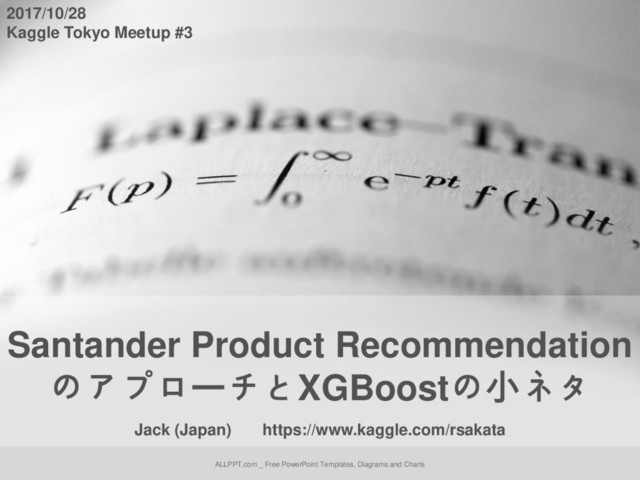 2 ℎ 2 + 1 2 2 + wに関する 一次のペナルティ xgboostのパラメータとの関係 • eta: 木の完成後、求めたwを前の予測値にそのまま足す のではなく、etaを掛けた上で足す(少しずつ改善していく) • gamma: 得られるgainがgamma以上ないと分岐NG • min_child_weight: σ ℎ が指定値以上無いと分岐NG (二乗誤差の場合は単純にサンプル数) • max_delta_step: 求めたwの絶対値がこれ以上だとcapさ れる • lambda: 左の通り(wに関する2次の正則化) • alpha: 左の通り(wに関する1次の正則化) XGBoostのアルゴリズムの概説 一般には ∆ ≈ =1 + 1 2 ℎ 2 + 1 2 2 二乗誤差の場合はイコールだが、 一般の場合には二次近似 最もlossを最小化するwの値は、 さっきの例(二乗誤差)の場合 = − σ , − + ∆ = − 1 2 σ , − 2 + これを上式に代入すると、 ∆ = =1 , − + 1 2 2 + 1 2 2 ∆ ≈ − 1 2 σ 2 σ ℎ + これを上式に代入すると、 = − σ σ ℎ + : grad ℎ : hess 上の近似の下で、最適解は、 (サンプルi)