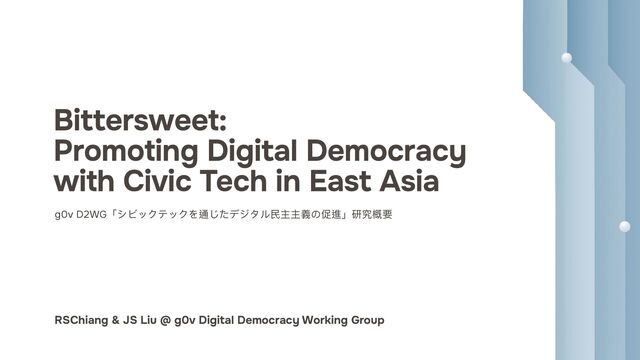 In this talk, g0v.tw contributors JS, RS, and Chihao will share findings from their first-year research project on Public-Private Partnerships (PPP) between civic tech projects and governments in East Asia. For the first time, they will present and discuss findings from eight case studies across Japan, Korea, and Taiwan. The session will explore various ways governments partner with the civic tech community, lessons learned from unsustainable PPPs, and the benefits of PPPs for democratic development. Finally, speakers will also present policy recommendations based on interviews conducted over the past year, reviewed by international experts, in the hope to illustrate how civic tech PPPs have and can contribute to the development of digital public services and strengthening of democratic resilience in their respective countries.