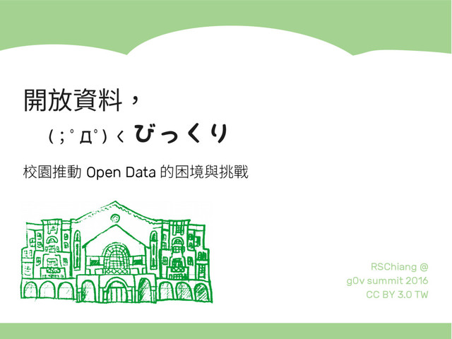 「開放資料嚇一跳:校園推動 Open Data 的困境與挑戰」/ “Challenges on campus open data movement.” 2016/5/15 Lightning Talk @ g0v summit 2016, Academia Sinica, Taipei, Taiwan.