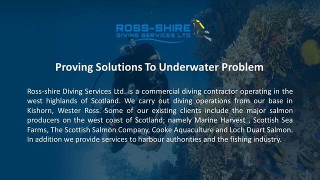 Ross-shire Diving Services Ltd. is a commercial diving contractor operating in the west highlands of Scotland. We carry out diving operations from our base in Kishorn, Wester Ross. Some of our existing clients include the major salmon producers on the west coast of Scotland; namely Marine Harvest , Scottish Sea Farms, The Scottish Salmon Company, Cooke Aquaculture and Loch Duart Salmon. In addition we provide services to harbour authorities and the fishing industry. Visit at https://rsdiving.com/