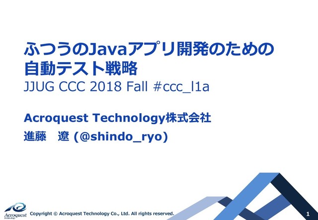 ふつうのJavaアプリ開発のための 自動テスト戦略 JJUG CCC 2018 Fall #ccc_l1a Acroquest Technology株式会社 進藤 遼 (@shindo_ryo)