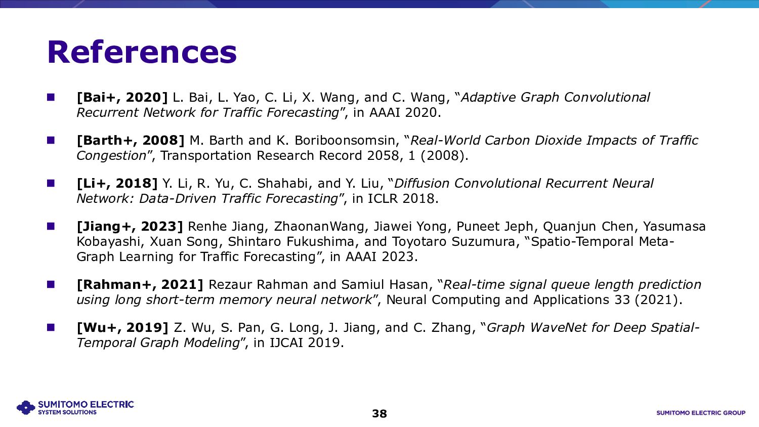 Li, X. Wang, and C. Wang, “Adaptive Graph Convolutional Recurrent Network for Traffic Forecasting”, in AAAI 2020. [Barth+, 2008] M. Barth and K. Boriboonsomsin, “Real-World Carbon Dioxide Impacts of Traffic Congestion”, Transportation Research Record 2058, 1 (2008). [Li+, 2018] Y. Li, R. Yu, C. Shahabi, and Y. Liu, “Diffusion Convolutional Recurrent Neural Network: Data-Driven Traffic Forecasting”, in ICLR 2018. [Jiang+, 2023] Renhe Jiang, ZhaonanWang, Jiawei Yong, Puneet Jeph, Quanjun Chen, Yasumasa Kobayashi, Xuan Song, Shintaro Fukushima, and Toyotaro Suzumura, “Spatio-Temporal Meta- Graph Learning for Traffic Forecasting”, in AAAI 2023. [Rahman+, 2021] Rezaur Rahman and Samiul Hasan, “Real-time signal queue length prediction using long short-term memory neural network”, Neural Computing and Applications 33 (2021). [Wu+, 2019] Z. Wu, S. Pan, G. Long, J. Jiang, and C. Zhang, “Graph WaveNet for Deep Spatial- Temporal Graph Modeling”, in IJCAI 2019.