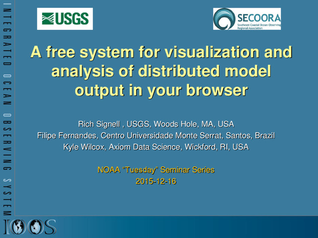 output in your browser Rich Signell , USGS, Woods Hole, MA, USA Filipe Fernandes, Centro Universidade Monte Serrat, Santos, Brazil Kyle Wilcox, Axiom Data Science, Wickford, RI, USA NOAA “Tuesday” Seminar Series 2015-12-16
