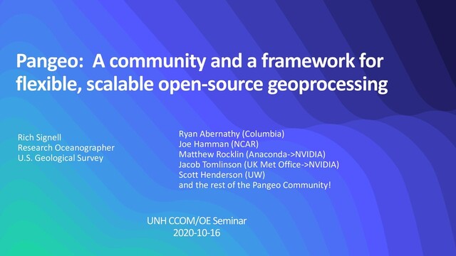 geoprocessing Rich Signell Research Oceanographer U.S. Geological Survey Ryan Abernathy (Columbia) Joe Hamman (NCAR) Matthew Rocklin (Anaconda->NVIDIA) Jacob Tomlinson (UK Met Office->NVIDIA) Scott Henderson (UW) and the rest of the Pangeo Community! UNH CCOM/OE Seminar 2020-10-16