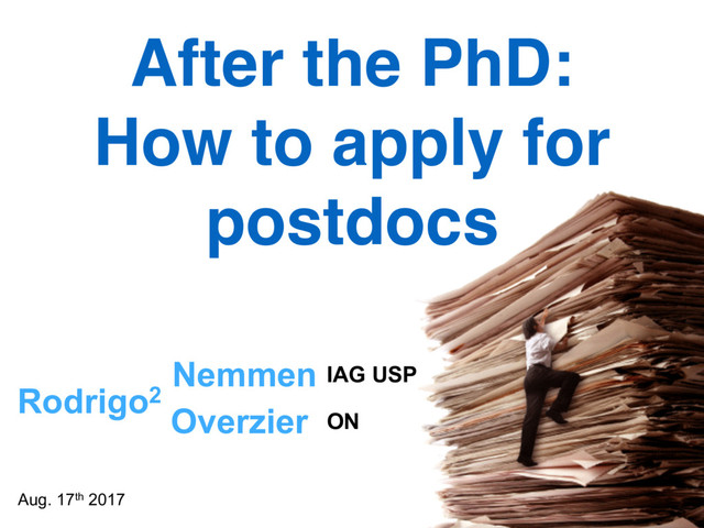 In this informal seminar, our goal is to demystify the process of applying for postdoctoral positions available outside Brasil. We will: present a lucid picture of the job market for postdocs abroad, give an outline of the different kinds of postdoc opportunities available (e.g. fellowships), application procedures, deadlines and how to be prepared. Both speakers are experienced in the international scientific arena.