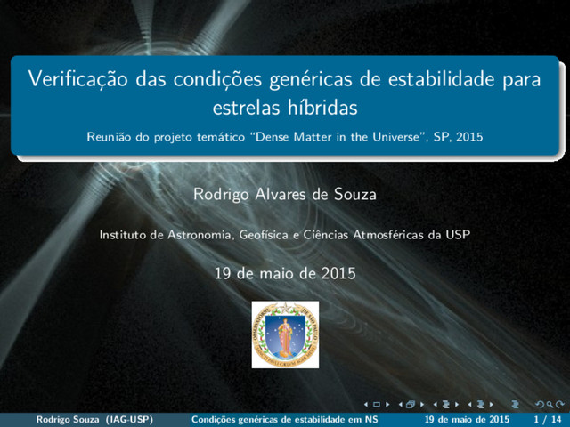 do projeto temático “Dense Matter in the Universe”, SP, 2015 Rodrigo Alvares de Souza Instituto de Astronomia, Geofísica e Ciências Atmosféricas da USP 19 de maio de 2015 Rodrigo Souza (IAG-USP) Condições genéricas de estabilidade em NS 19 de maio de 2015 1 / 14