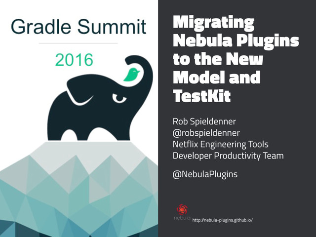 An overview of Nebula Gradle plugins for 2016. A little bit about moving some plugins to the new model. And a little of our experience switching from nebula-test to TestKit.