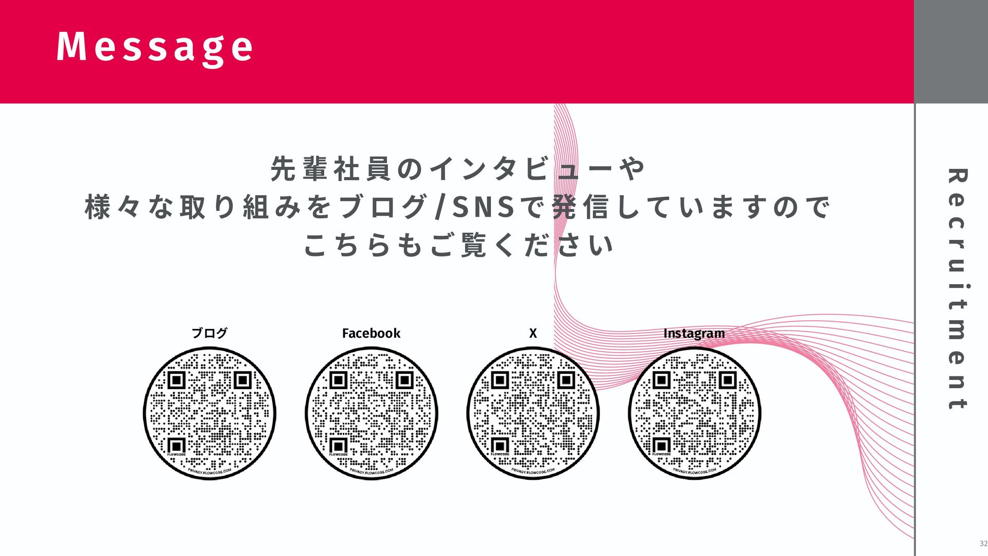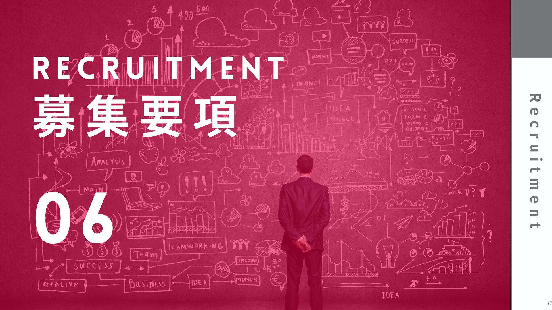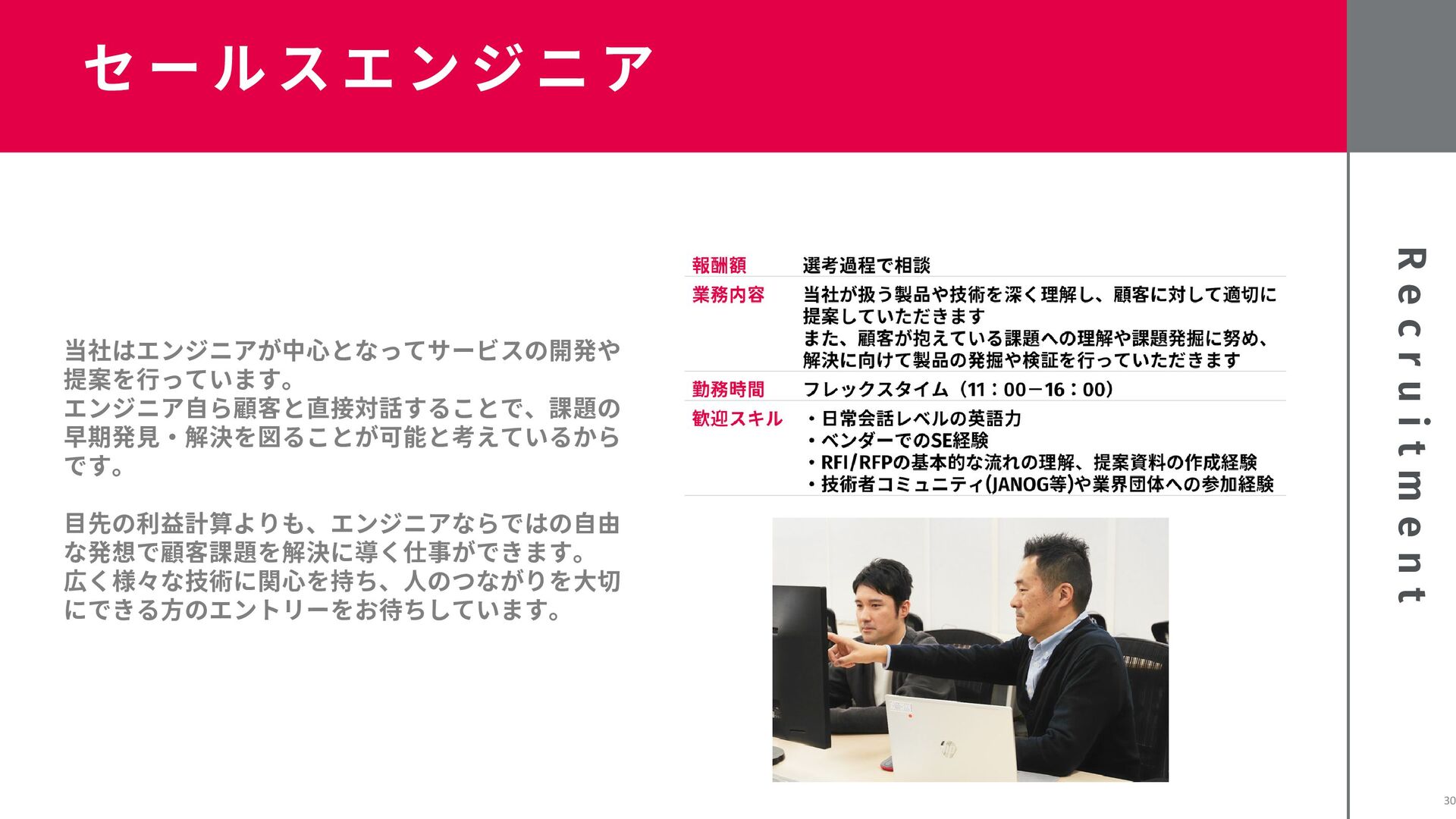 R e c r u i t m e n t 当社はエンジニアが中心となってサービスの開発や 提案を行っています。 エンジニア自ら顧客と直接対話することで、課題の 早期発見・解決を図ることが可能と考えているから です。 目先の利益計算よりも、エンジニアならではの自由 な発想で顧客課題を解決に導く仕事ができます。 広く様々な技術に関心を持ち、人のつながりを大切 にできる方のエントリーをお待ちしています。