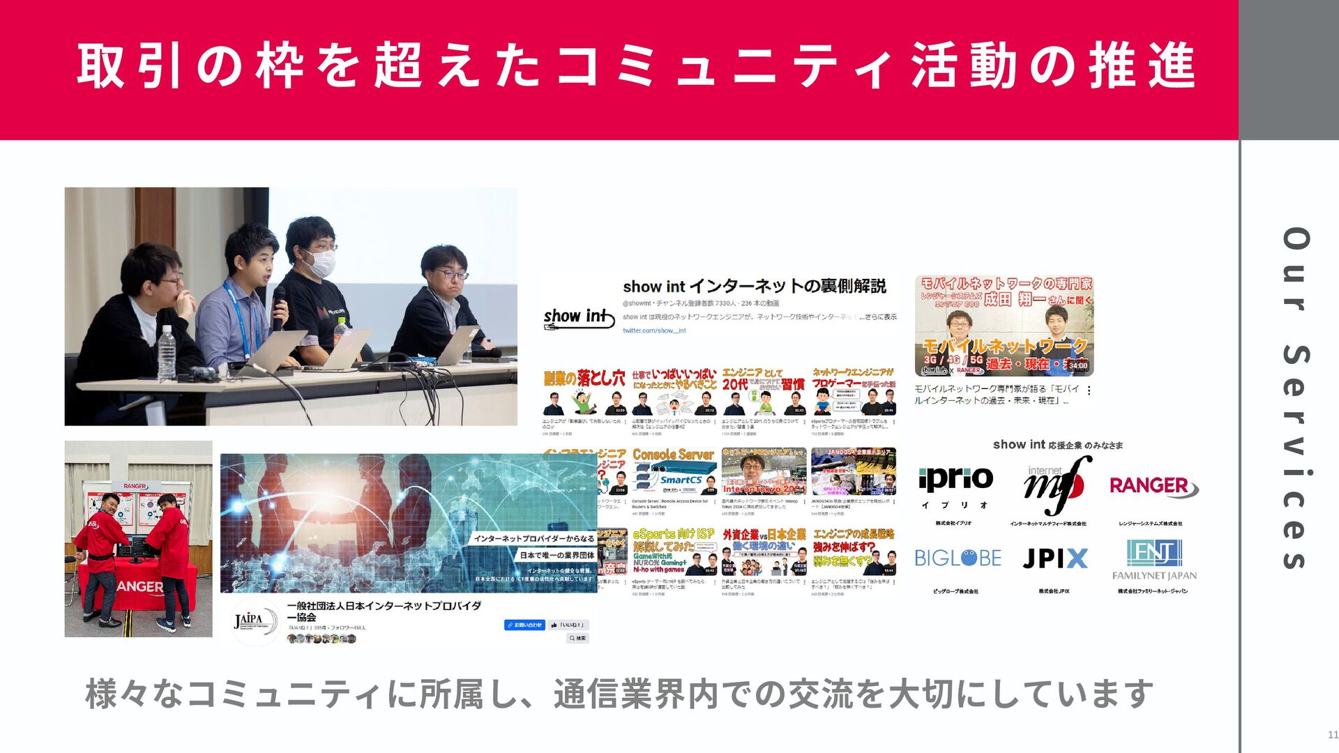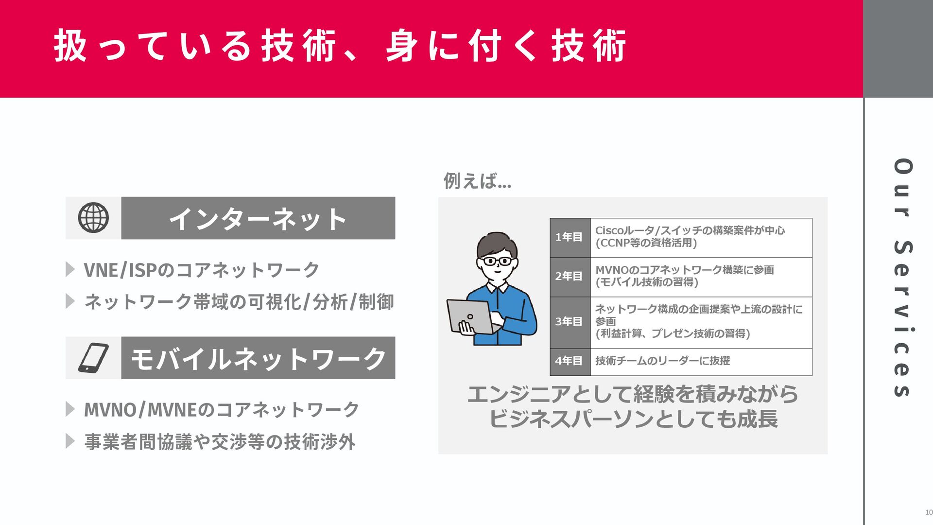 付 く 技 術 O u r S e r v i c e s モバイルネットワーク MVNO/MVNEのコアネットワーク 事業者間協議や交渉等の技術渉外 インターネット VNE/ISPのコアネットワーク ネットワーク帯域の可視化/分析/制御 例えば... 1年目 Ciscoルータ/スイッチの構築案件が中心 (CCNP等の資格活用) 2年目 MVNOのコアネットワーク構築に参画 (モバイル技術の習得) 3年目 ネットワーク構成の企画提案や上流の設計に 参画 (利益計算、プレゼン技術の習得) 4年目 技術チームのリーダーに抜擢 エンジニアとして経験を積みながら ビジネスパーソンとしても成長 10