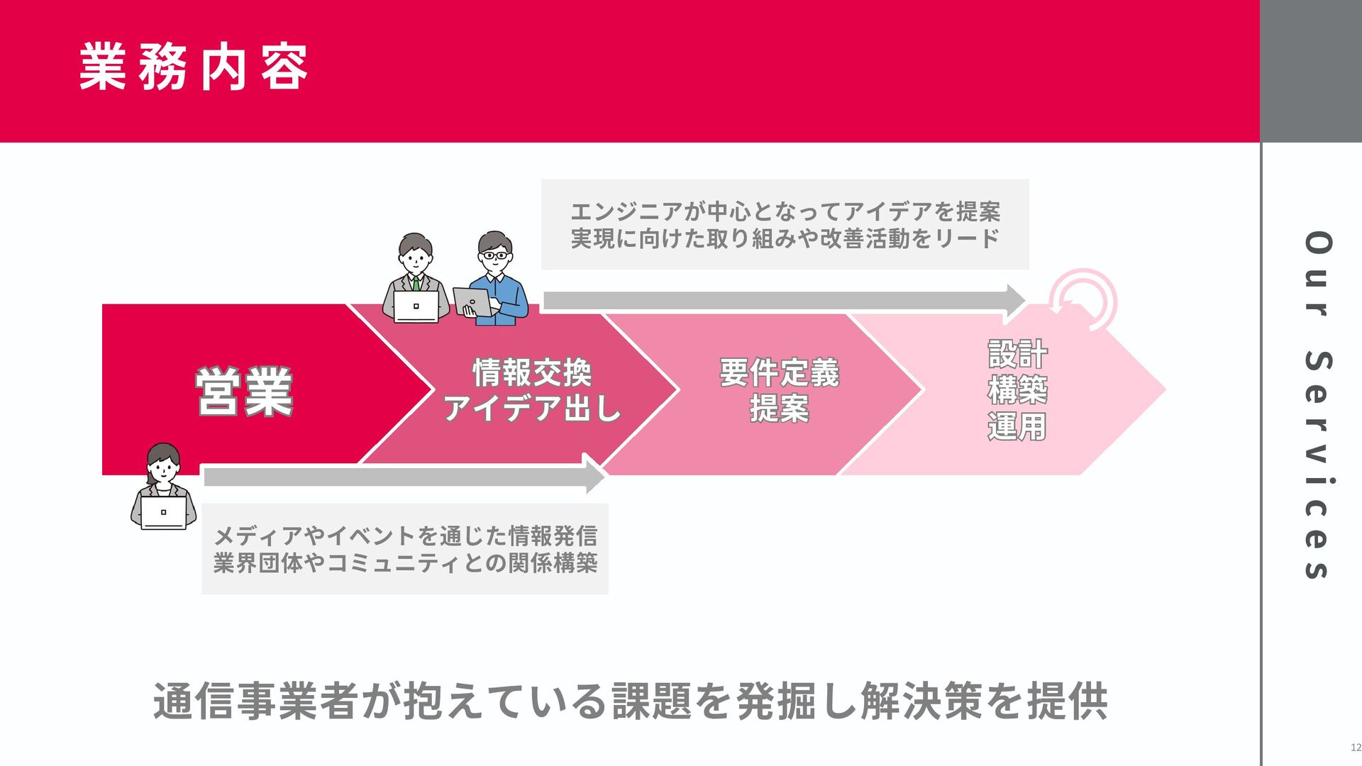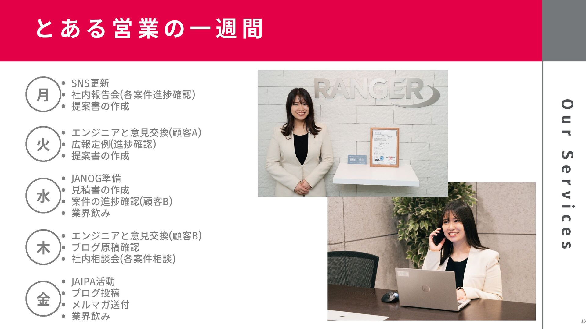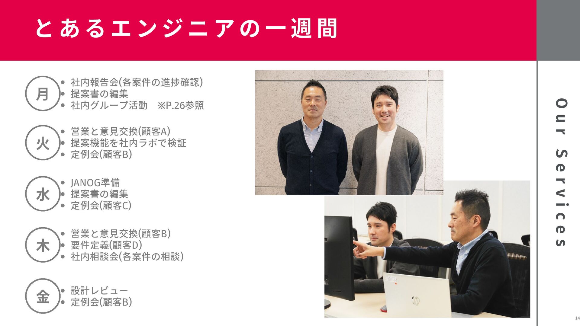 u r S e r v i c e s 月 SNS更新 社内報告会(各案件進捗確認) 提案書の作成 火 エンジニアと意見交換(顧客A) 広報定例(進捗確認) 提案書の作成 水 JANOG準備 見積書の作成 案件の進捗確認(顧客B) 業界飲み 木 エンジニアと意見交換(顧客B) ブログ原稿確認 社内相談会(各案件相談) 金 JAIPA活動 ブログ投稿 メルマガ送付 業界飲み 13