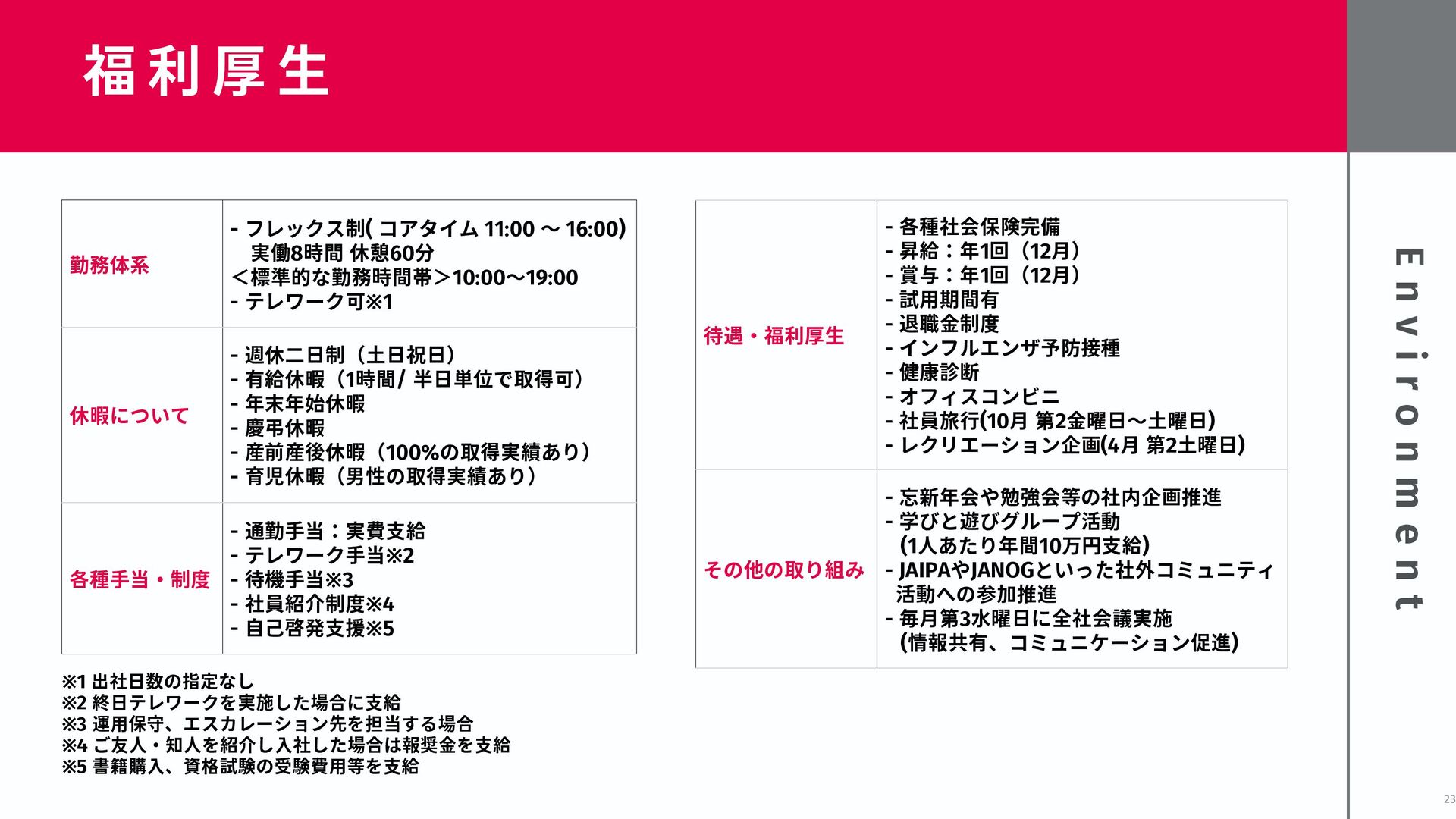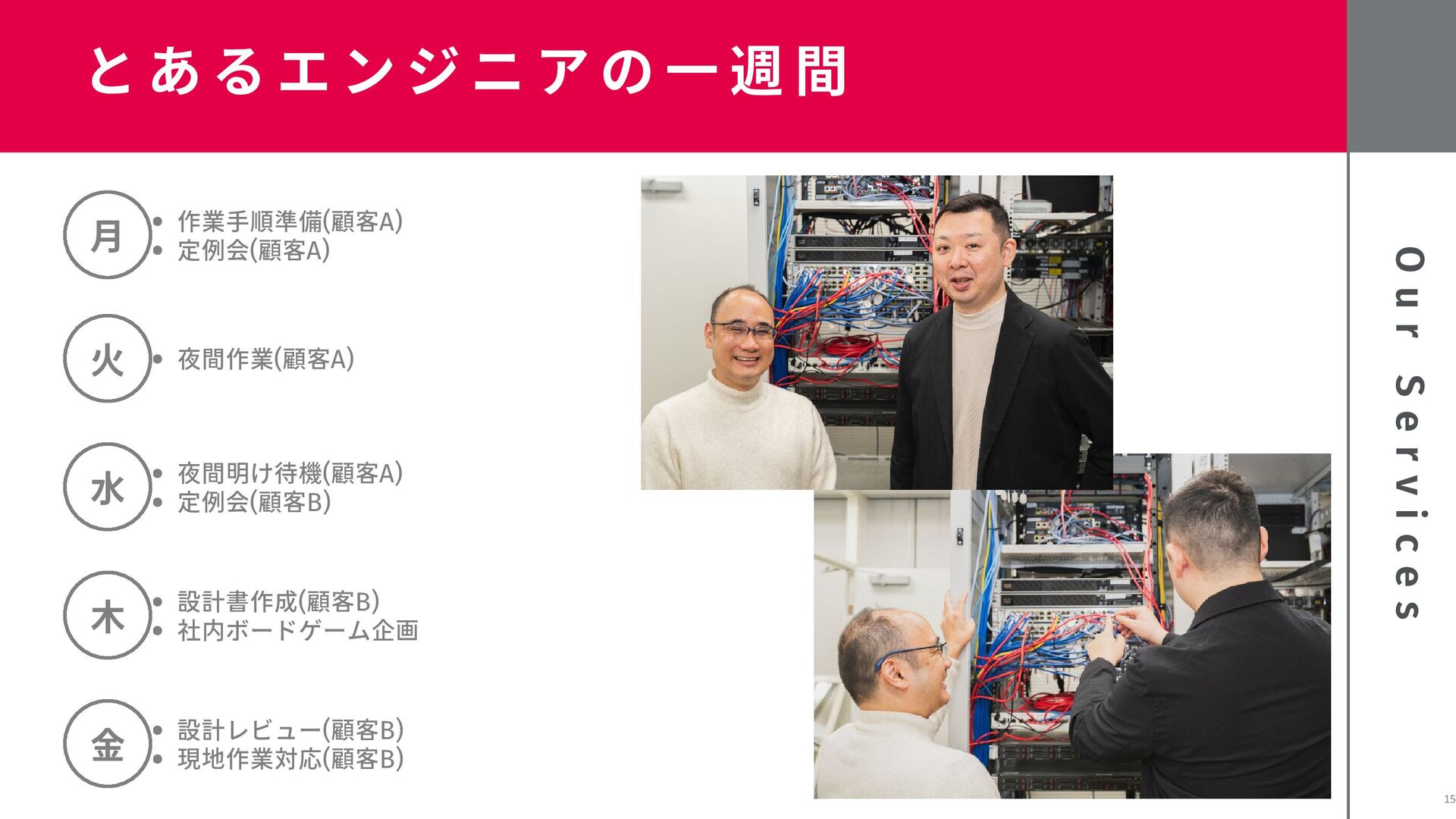 週 間 O u r S e r v i c e s 月 社内報告会(各案件の進捗確認) 提案書の編集 社内グループ活動 ※P.26参照 火 営業と意見交換(顧客A) 提案機能を社内ラボで検証 定例会(顧客B) 水 JANOG準備 提案書の編集 定例会(顧客C) 木 営業と意見交換(顧客B) 要件定義(顧客D) 社内相談会(各案件の相談) 金 設計レビュー 定例会(顧客B) 14