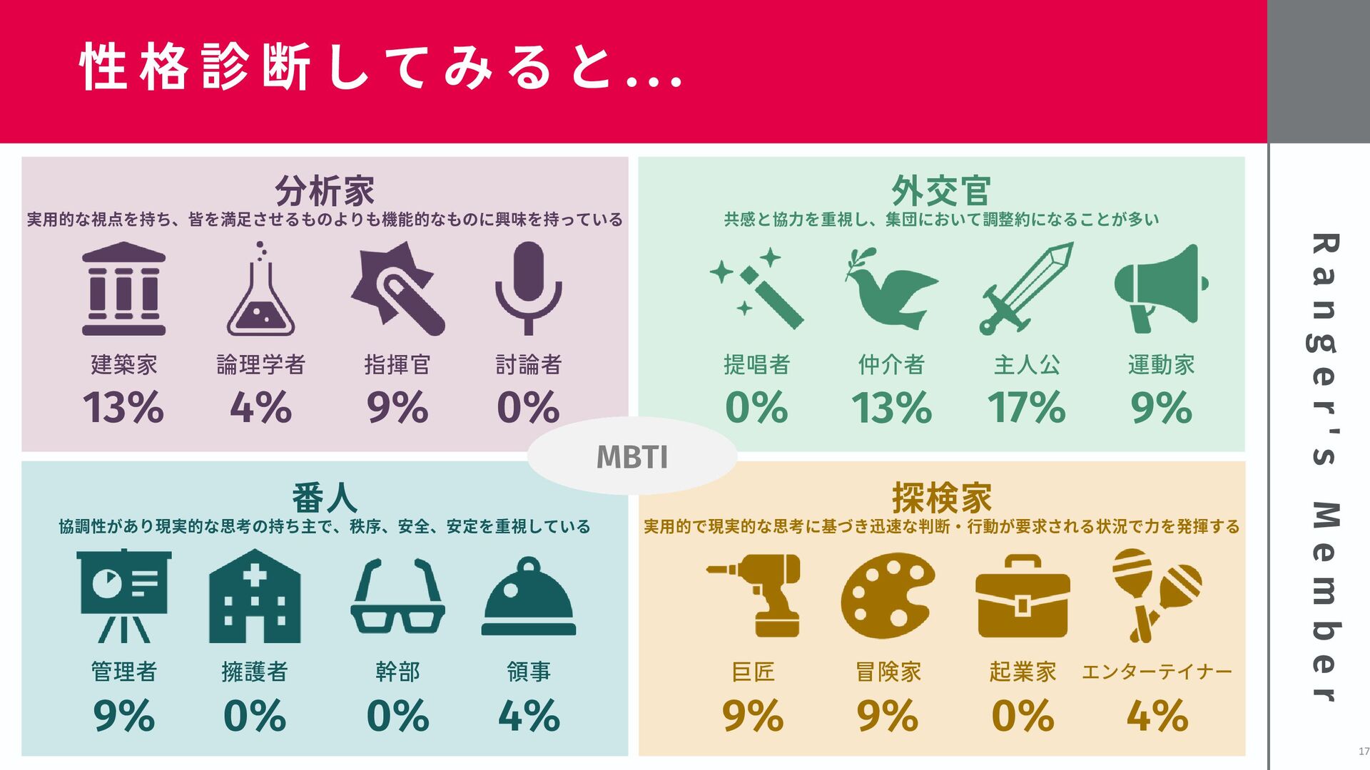 . . R a n g e r ' s M e m b e r 分析家 実用的な視点を持ち、皆を満足させるものよりも機能的なものに興味を持っている 建築家 13% 論理学者 4% 指揮官 9% 討論者 0% 番人 協調性があり現実的な思考の持ち主で、秩序、安全、安定を重視している 管理者 9% 擁護者 0% 幹部 0% 領事 4% 外交官 共感と協力を重視し、集団において調整約になることが多い 提唱者 0% 仲介者 13% 主人公 17% 運動家 9% 探検家 実用的で現実的な思考に基づき迅速な判断・行動が要求される状況で力を発揮する 巨匠 9% 冒険家 9% 起業家 0% エンターテイナー 4% MBTI 17