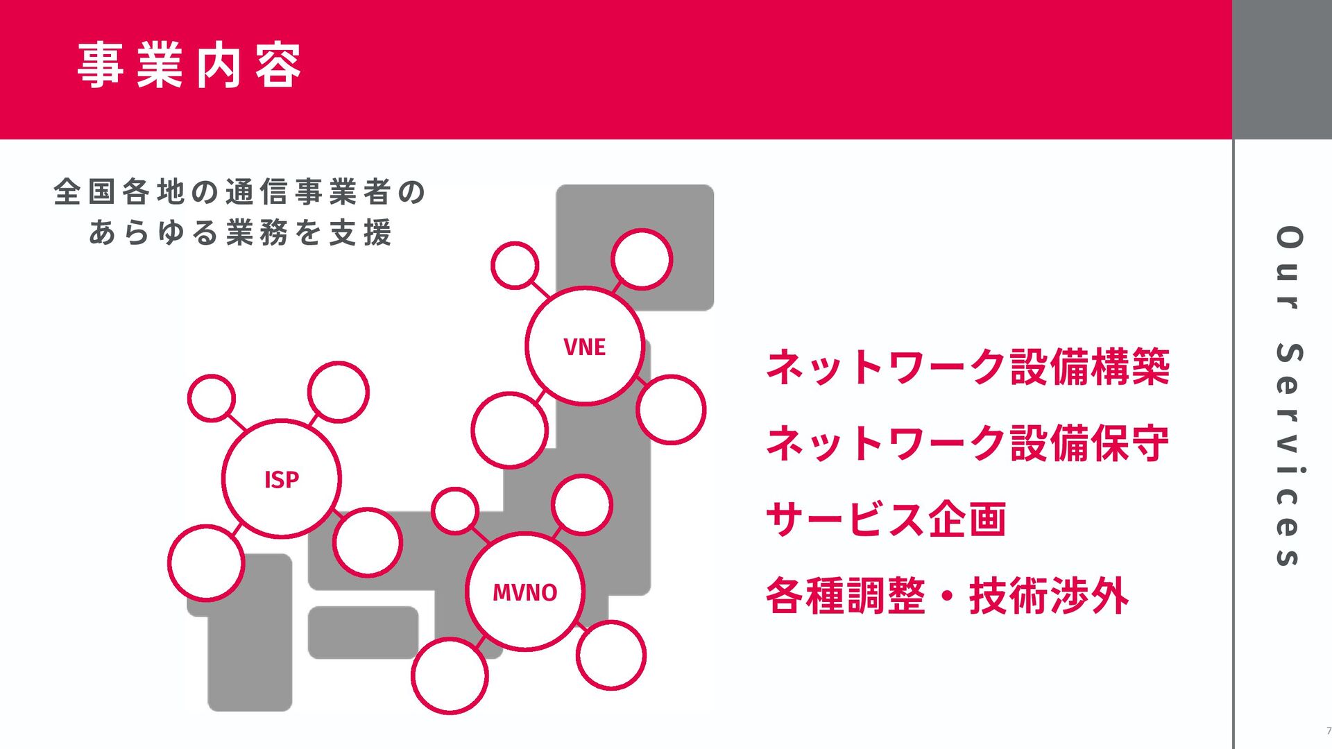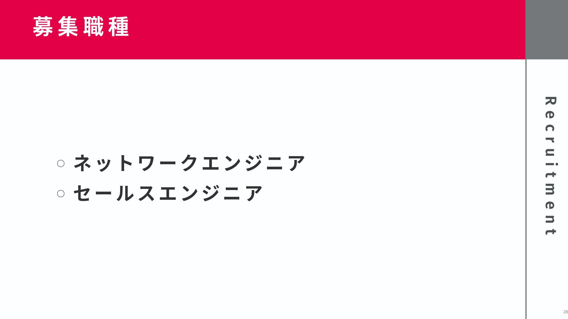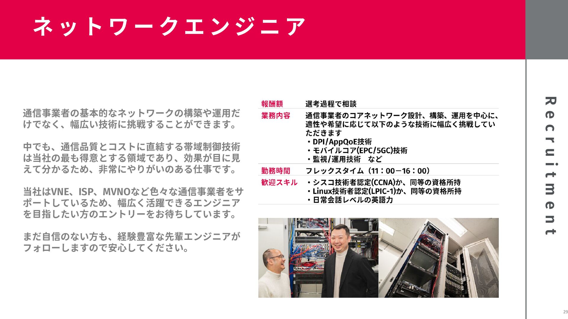 ニ ア R e c r u i t m e n t 通信事業者の基本的なネットワークの構築や運用だ けでなく、幅広い技術に挑戦することができます。 中でも、通信品質とコストに直結する帯域制御技術 は当社の最も得意とする領域であり、効果が目に見 えて分かるため、非常にやりがいのある仕事です。 当社はVNE、ISP、MVNOなど色々な通信事業者をサ ポートしているため、幅広く活躍できるエンジニア を目指したい方のエントリーをお待ちしています。 まだ自信のない方も、経験豊富な先輩エンジニアが フォローしますので安心してください。
