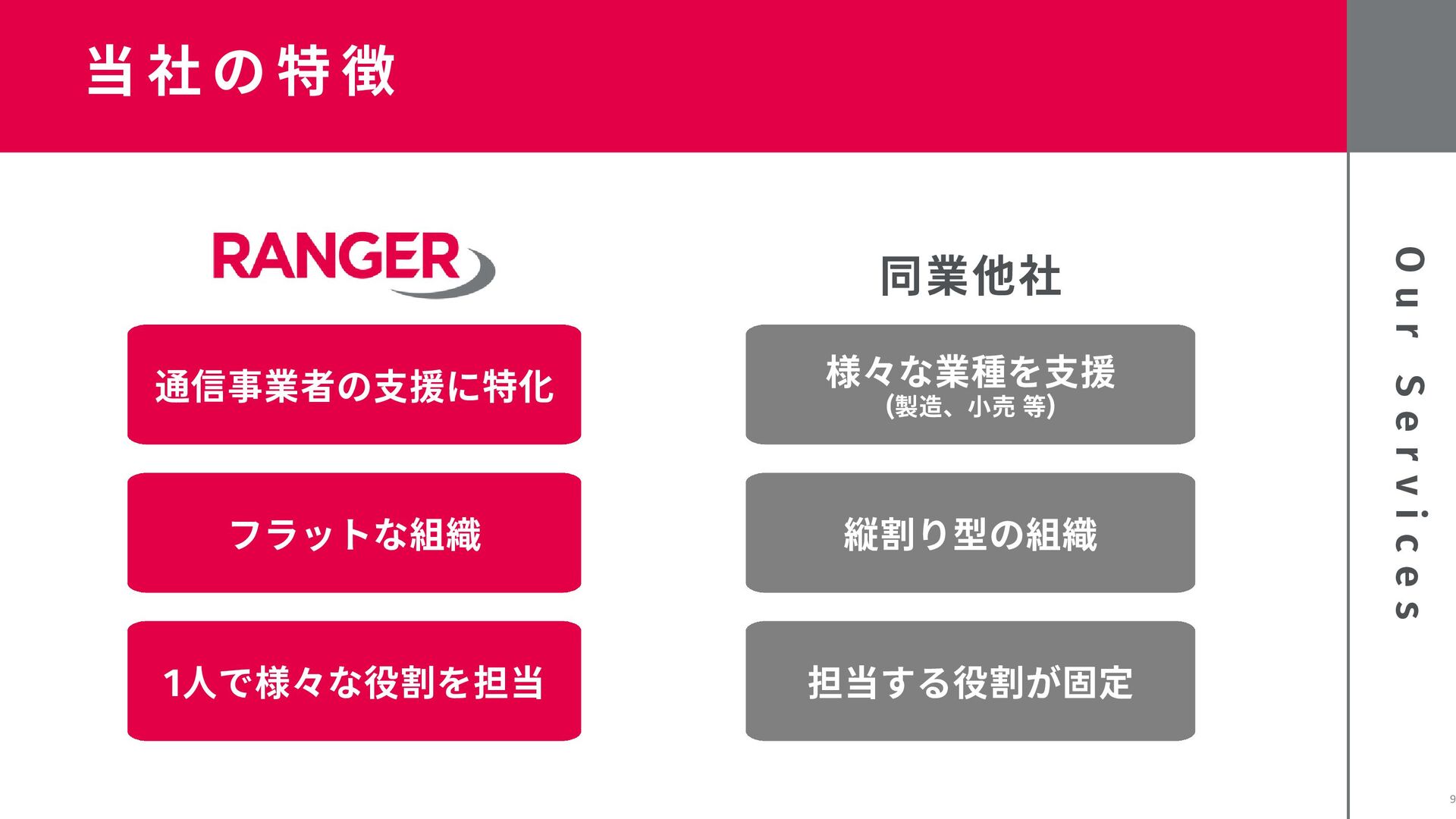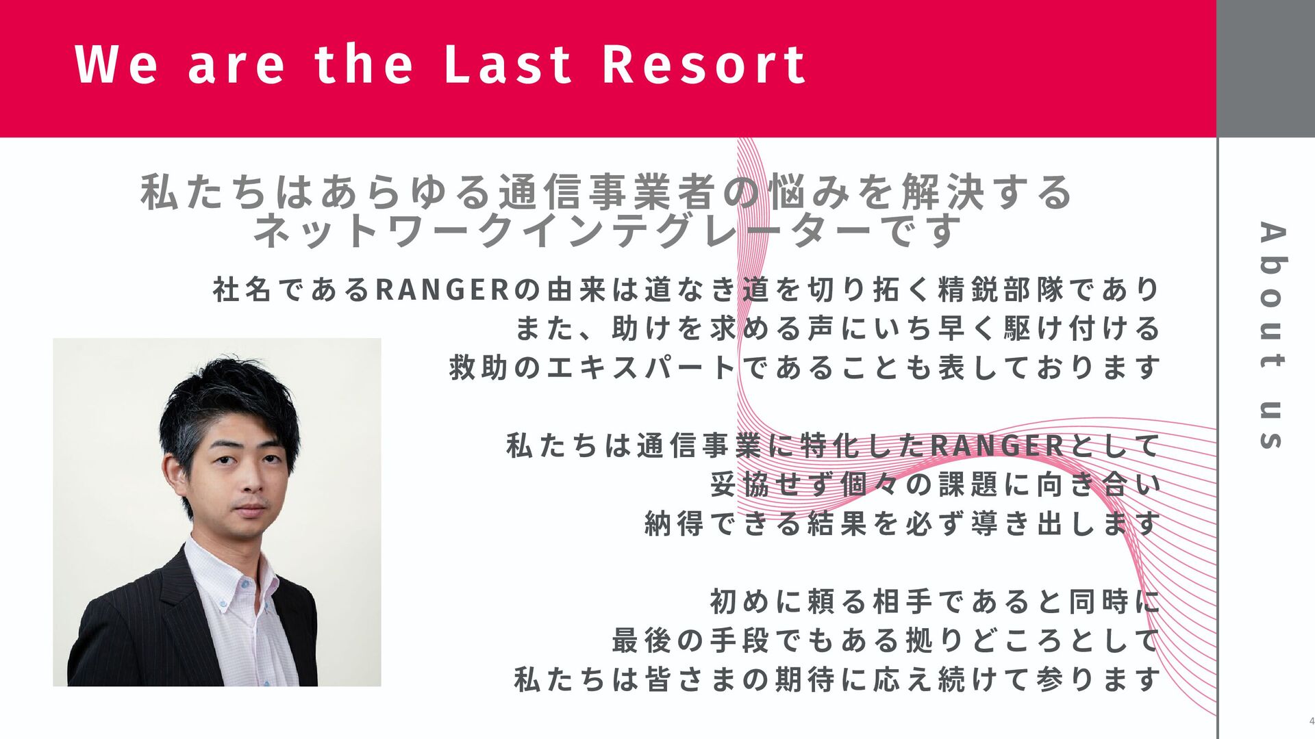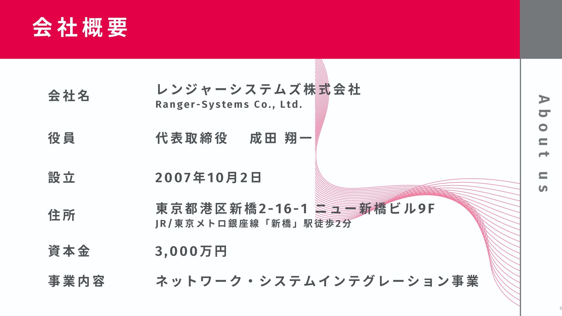 s 会社名 レンジャーシステムズ株式会社 R a n g e r - S y s t e m s C o . , L t d . 役員 代表取締役 成田 翔一 設立 2007年10月2日 住所 東京都港区新橋2-16-1 ニュー新橋ビル9F J R / 東 京 メ ト ロ 銀 座 線 「 新 橋 」 駅 徒 歩 2 分 資本金 3,000万円 事業内容 ネットワーク・システムインテグレーション事業 5
