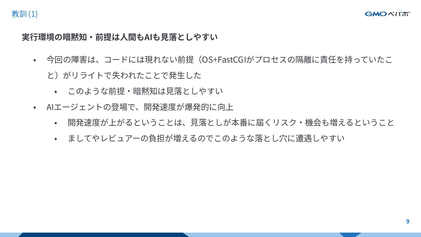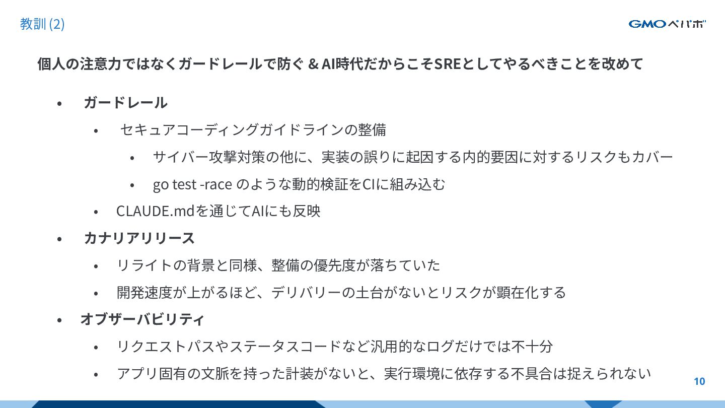 test -race のような動的検証をCIに組み込む • CLAUDE.mdを通じてAIにも反映 • カナリアリリース • リライトの背景と同様、整備の優先度が落ちていた • 開発速度が上がるほど、デリバリーの⼟台がないとリスクが顕在化する • オブザーバビリティ • リクエストパスやステータスコードなど汎⽤的なログだけでは不⼗分 • アプリ固有の⽂脈を持った計装がないと、実⾏環境に依存する不具合は捉えられない 個⼈の注意⼒ではなくガードレールで防ぐ & AI時代だからこそSREとしてやるべきことを改めて 10