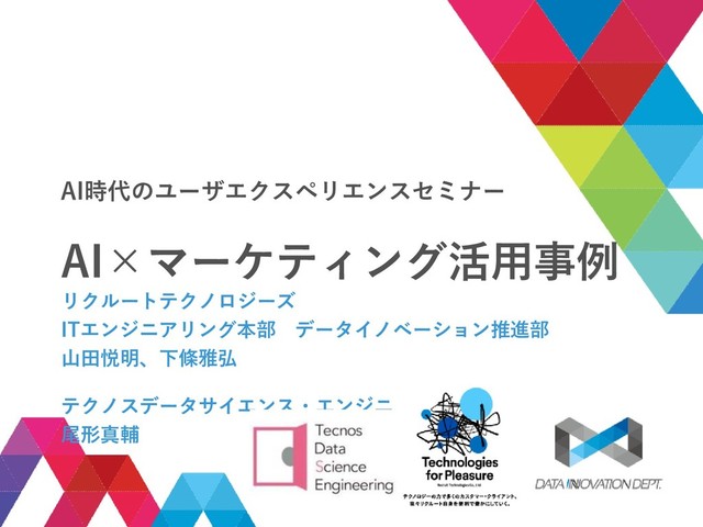 AI時代のユーザエクスペリエンスセミナー AI×マーケティング活用事例 リクルートテクノロジーズ ITエンジニアリング本部 データイノベーション推進部 山田悦明、下條雅弘 テクノスデータサイエンス・エンジニアリング 尾形真輔