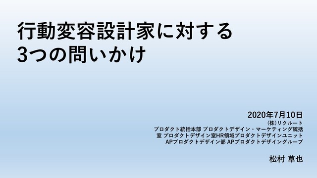 ⾏動変容設計家に対する 3つの問いかけ 2020年7⽉10⽇ (株)リクルート プロダクト統括本部 プロダクトデザイン・マーケティング統括 室 プロダクトデザイン室HR領域プロダクトデザインユニット APプロダクトデザイン部 APプロダクトデザイングループ