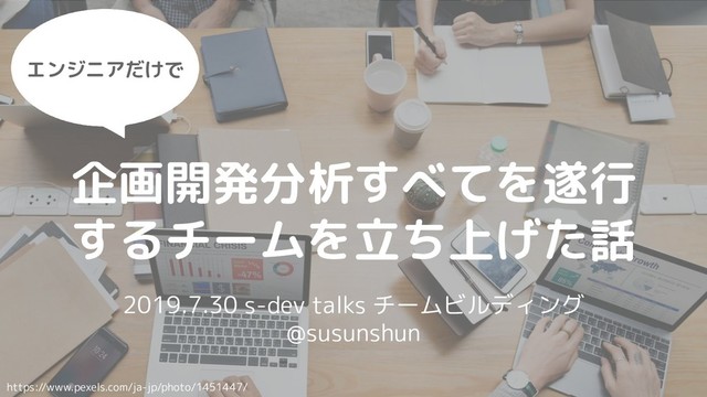 企画開発分析すべてを遂行 するチームを立ち上げた話 2019.7.30 s-dev talks チームビルディング @susunshun https://www.pexels.com/ja-jp/photo/1451447/ エンジニアだけで