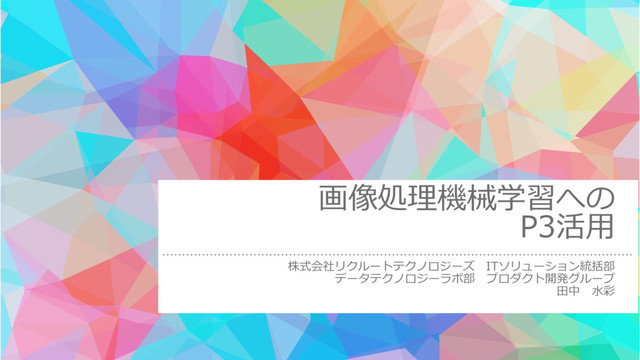 画像処理機械学習への P3活用 株式会社リクルートテクノロジーズ ITソリューション統括部 データテクノロジーラボ部 プロダクト開発グループ 田中 水彩