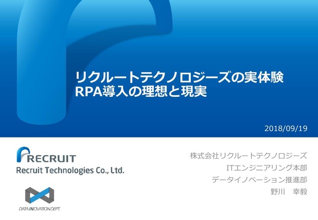 株式会社リクルートテクノロジーズ ITエンジニアリング本部 データイノベーション推進部 野川 幸毅 リクルートテクノロジーズの実体験 RPA導入の理想と現実 2018/09/19