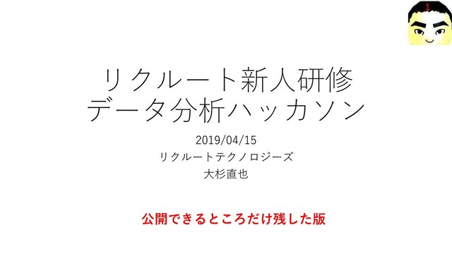 リクルート新人研修 データ分析ハッカソン 2019/04/15 リクルートテクノロジーズ 大杉直也 1 公開できるところだけ残した版