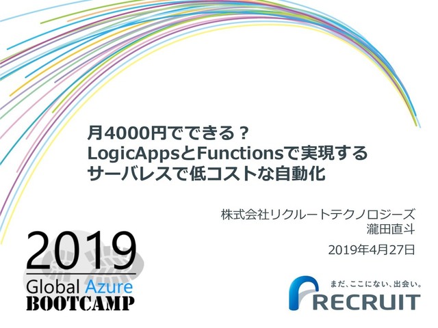 ⽉4000円でできる? LogicAppsとFunctionsで実現する サーバレスで低コストな⾃動化 株式会社リクルートテクノロジーズ 瀧⽥直⽃ 2019年4⽉27⽇