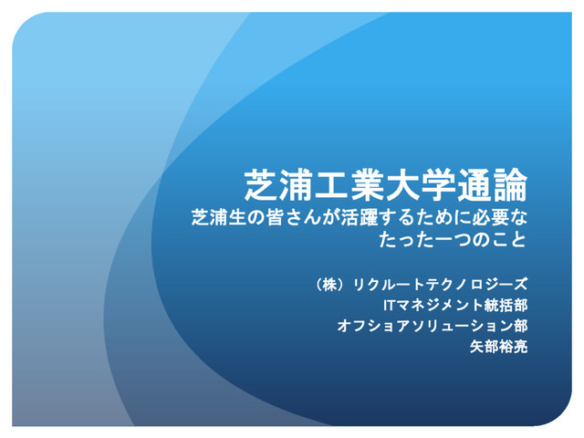 芝浦工業大学通論 芝浦生の皆さんが活躍するために必要な たった一つのこと (株)リクルートテクノロジーズ ITマネジメント統括部 オフショアソリューション部 矢部裕亮
