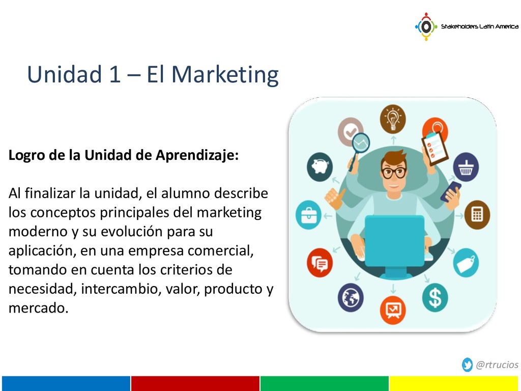 de Aprendizaje: Al finalizar la unidad, el alumno describe los conceptos principales del marketing moderno y su evolución para su aplicación, en una empresa comercial, tomando en cuenta los criterios de necesidad, intercambio, valor, producto y mercado.