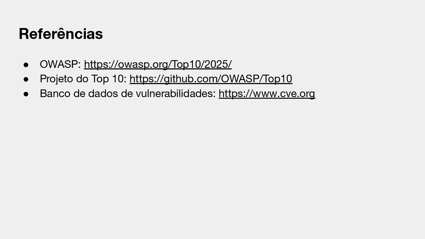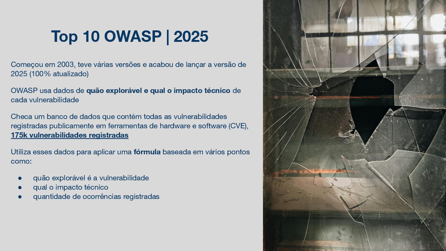 versões e acabou de lançar a versão de 2025 (100% atualizado) OWASP usa dados de quão explorável e qual o impacto técnico de cada vulnerabilidade Checa um banco de dados que contém todas as vulnerabilidades registradas publicamente em ferramentas de hardware e software (CVE), 175k vulnerabilidades registradas Utiliza esses dados para aplicar uma fórmula baseada em vários pontos como: • quão explorável é a vulnerabilidade • qual o impacto técnico • quantidade de ocorrências registradas
