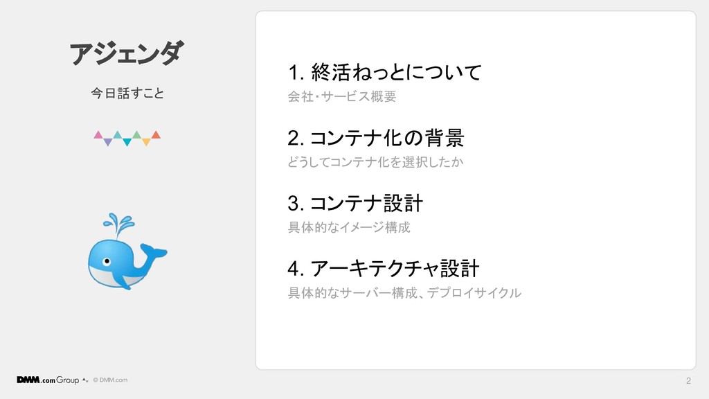 © DMM.com 1. 終活ねっとについて 会社・サービス概要 2. コンテナ化の背景 どうしてコンテナ化を選択したか 3. コンテナ設計
