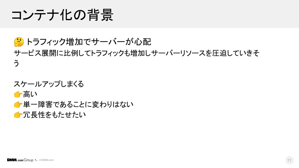 © DMM.com コンテナ化の背景 11 トラフィック増加でサーバーが心配 サービス展開に比例してトラフィックも増加しサーバーリソースを圧迫していきそ う スケールアップしまくる 高い 単一障害であることに変わりはない