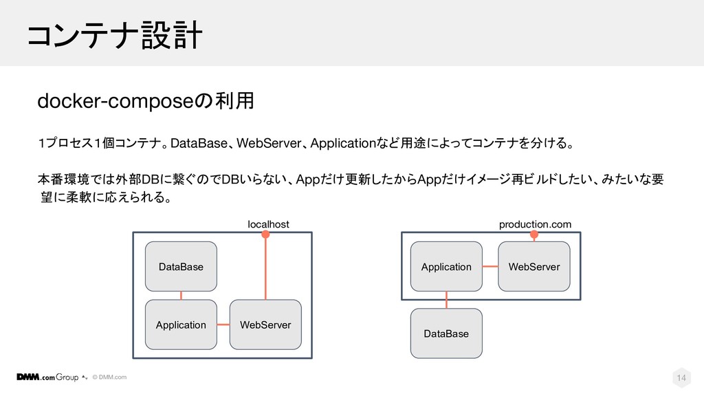 © DMM.com docker-composeの利用 1プロセス1個コンテナ。DataBase、WebServer、Applicationなど用途によってコンテナを分ける。 本番環境では外部DBに繋ぐのでDBいらない、Appだけ更新したからAppだけイメージ再ビルドしたい、みたいな要 望に柔軟に応えられる。 14 コンテナ設計 DataBase Application