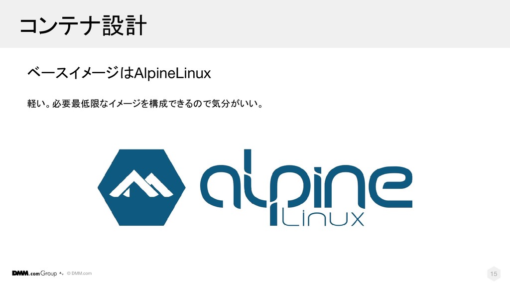 © DMM.com ベースイメージはAlpineLinux 軽い。必要最低限なイメージを構成できるので気分がいい。 15 コンテナ設計